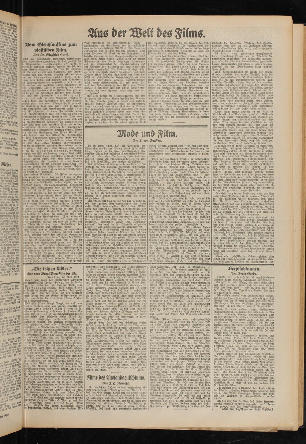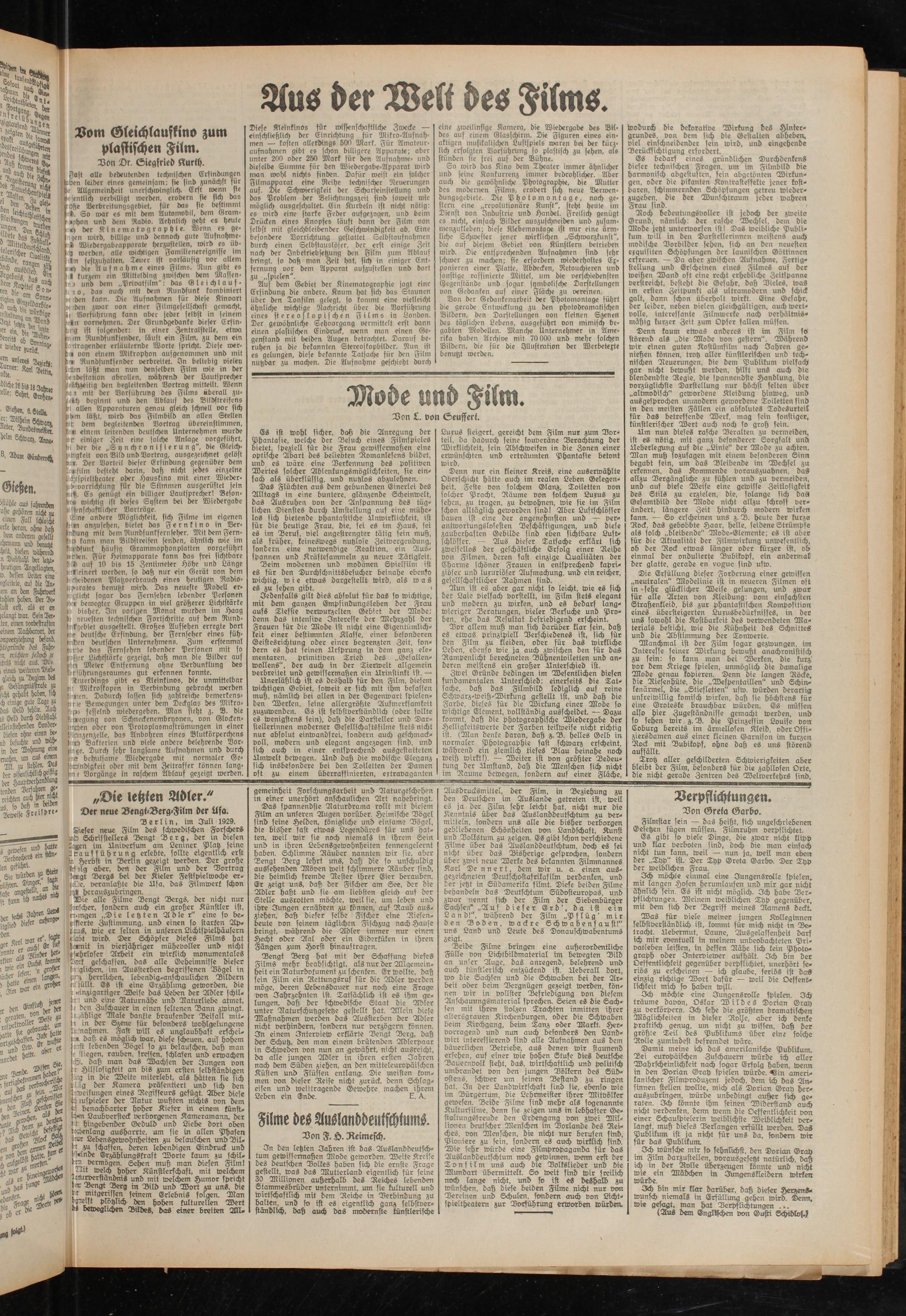 Die Erfüllung dieser Forderung einer gewissen „neutralen“ Modelinie ist in neueren Filmen oft in »sehr glücklicher Weise gelungen, und zwar für alle Arten von Kleidung: vom einfachsten Strahenkleid, bis zur phantastischen Komposition eines übersteigerten Luxusbedürfnisses, in der uns sowohl die Kostbarkeit des verwendeten Materials besticht, wie die Kühnheit des Schnittes und die Abstimmung der Tonwerte.