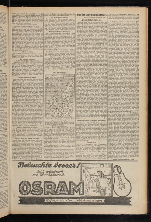 Lufttemperaturen am 23. September: mittags 16,7 Grad Celsius, abends 14,7 Grad; am 24. September: morgens 13 Grad. Maximum 17 Grad, Minimum 12,7 Grad. — Erdtemperaturen in 10 cm Tiefe: am 23. September:, abends 15,2 Grad; am 24. September: morgens ‘14,4 Grad Celsius. — Niederschlag 0,3 mm. — Sonnenscheindauer % Stunde.