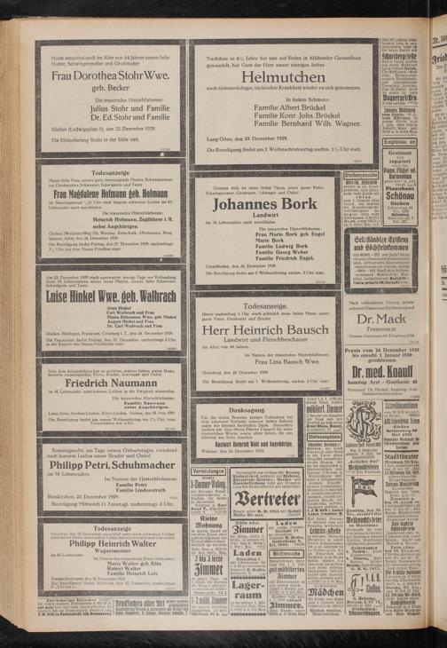 Die Beerdigung findet Freitag, den 27. Dezember 1929, nachmittags 2'/r Uhr, auf dem Neuen Friedhof statt