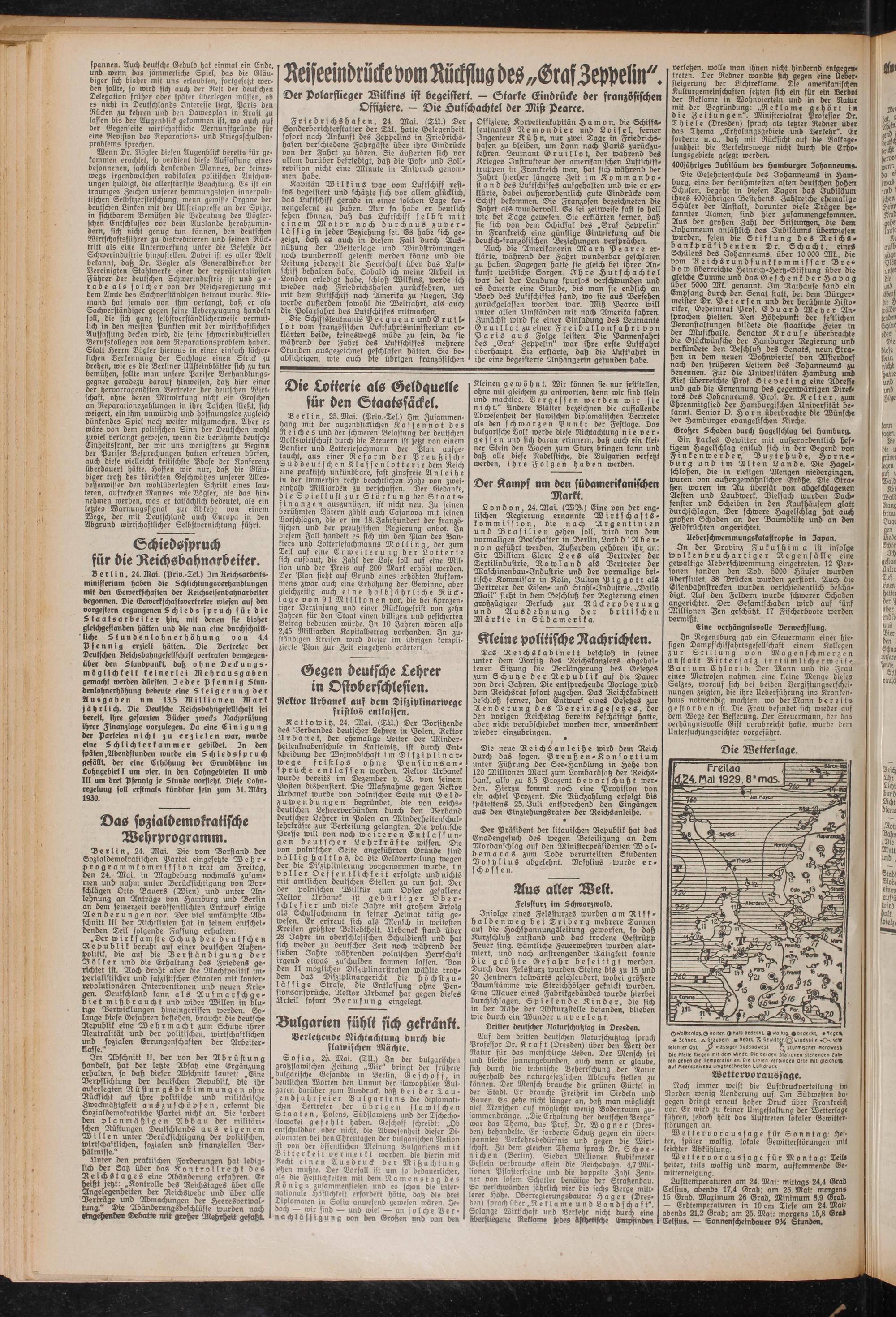 Lufttemperaturen am 24. Mai: mittags 24,4 Grad Celsius, abends 17,4 Grad: am 25. Mai: morgens 15 Grad. Maximum 26 Grad, Minimum 8,9 Grad. — Erdtemperaturen in 10 cm Tiefe am 24. Matt abends 21,2 Grad; am 25. Mai: morgens 15,8 Grad Celsius. — Sonnsnfcheindouer 9M Stunden.