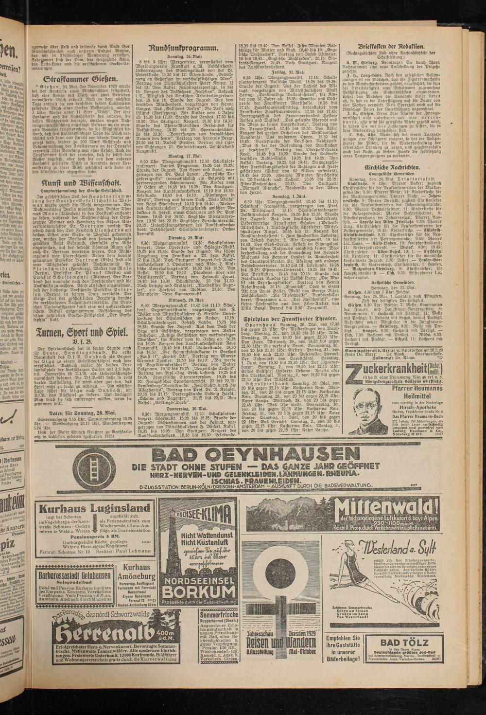 6,30: Morgengymnastik. 10,40 bis 11,10: Schulfunk: Gegenwartsstunde, vorgetragen von F. Weller und Mittelschullehrer H. Stridde: Unterweisung der Schulmädchen im Kochen. 13,15: Schallplattenkonzert: Joseph Haydn. 15,05 bis 15,35: Stunde 6er Jugend. Aus dem Buch der Sage und Geschichte, vorgetragen von Rektor Wehrhan: „Lustige Geschichten von merkwürdigen Menschen", für Kinder vom 10. Jahre ab. 16,35 bis 18,05: Konzert des Rundfunkorchesters: Reue Tanzmusik. 18,10 bis 18,30: Dücherstunde. 18,30 bis 18,50: „Die Homunkulus-Szene in Goethes „Faust II", zweiter Akt", Dortrag von Pfarrer Clemens Taesler. 18,50 bis 19,10: „Wie werde ich Vogelstimmforscher?". Dortrag von Walter Salzmann. 19,10 bis 19,25: „Reuzeitliche Technik', Dortrag von Dipl.-Ing. Erich Lahwih. 19,25 bis 19,35: Französische Literaturproben. 19,35 bis 20: Französischer Sprachunterricht. 20 bis 20,15: Senckenberg-Viertelstunde: „Herbstfahrt durch die Alleghanies", Dortrag von Prof. Dr. R. Kräusel. 20,15 bis 21,15: Dortragsstunde Ludwig Hardt.: „Scheine und Daganten". 21,15 bis 22,15: Don Kassel: „Erstlings-Werke".