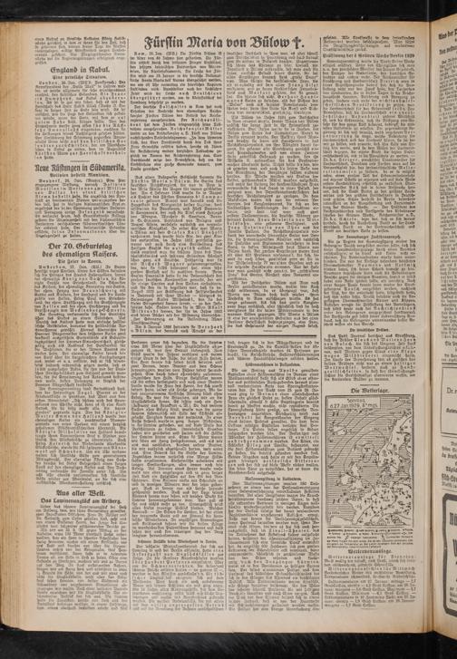 Als der Botschafter Bülow aus Rom nach Berlin zurückberusen wurde, wollte sein Koch nicht mitkommen, da er überzeugt war, dah Maria von Bülow doch bald wieder ihren Wohnsitz in Rom aufschlagen würde. GS hat lange gedauert, bis sich das greise Kanzlerpaar dazu entschloß, aber schließlich sind sie doch wenigstens für die kalten Wintermonate in den warmen Süden gegangen. Mit Maria v. Bülow ist eine der anziehendsten Gestalten aus der alten Berliner Gesellschaft dahingegangen, eine Frau, die das Geheimnis der ewigen Jugend besaß.