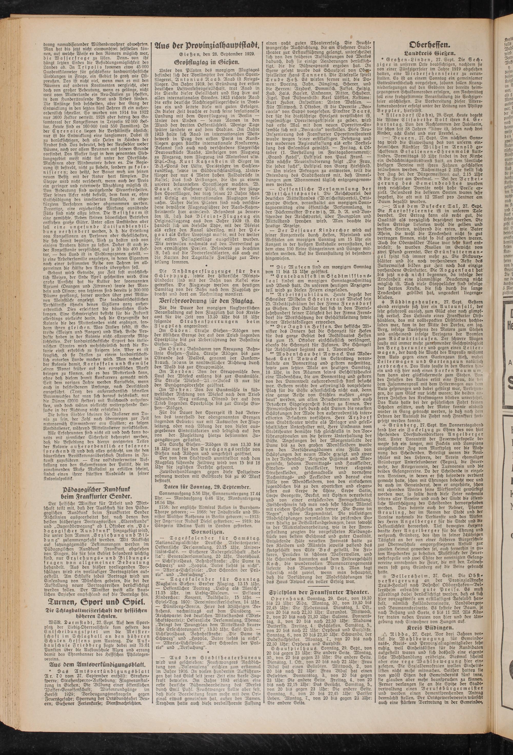 — Tageskalender für Sonntag. Flughafen Gießen: Großer Flugtag, 13.15 Uhr. — Öffentlicher Vortrag „Liebig als Mensch", 11.15 Uhr, im Liebig-Museum. — Dessauer Kinderchor: Konzert, Volkshalle, 15 Uhr. — Spiel-Dgg. 1900: Vereinsmeistersch aften, 14 älhr. — Dünsberg-Derein, Feier des 30jährigen Bestehens, nachmittags auf dem Dünsberg. — Reichspartei des deutschen MittelstanDes (Wirtschaftspartei): Oeffentliche Versammlung, Thema: „Bringt der Voungplan Dem Mittelstand steuerliche Erleichterungen?", 13.30 Uhr, Cafe Leib. — Lichtspielhaus, Bahnhofstraße: „Die Dame in Schwarz" und „Hoppla, Vater fiehts ja nicht". — Astoria-Lichtspiele: „Der Schrecken der Prärie" und „Versuchung".