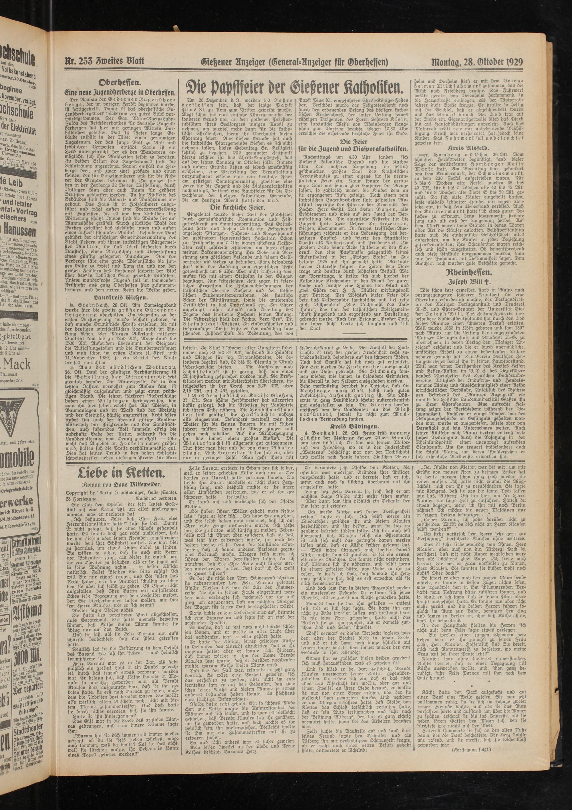 Am 20. Dezember d. I. werden 50 Jahre verflossen fein, daß der jetzige Papst Pius XI. zu Rom zum Prister geweiht wurde. Liegt schon für eine einfache Pfarrgemeinde besonderer Grund vor. an dem goldenen Priesterjubiläum ihres Seelsorgers innigen Anteil zu nehmen, um wieviel mehr dann für die katholische Christenheit, wenn ihr Oberhaupt diesen Ehrentag feiert! Aus diesem Grunde hat auch die katholische Pfarrgemeinde Gießen es sich nicht nehmen lassen, diesen Gedenktag Sr. Heiligkeit festlich zu begehen. Als geeigneter Zeitpunkt hierzu erschien ihr das Christ-Königs-Fest, das auf den letzten Sonntag im Oktober fällt. Innere und äußere Gründe liehen es jedoch zweckmäßig erscheinen, eine Dreiteilung der Veranstaltung vorzunehmen: erstens eine rein kirchliche Feier am gestrigen Sonntagvormittag, zweitens eine Feier für die Jugend und die Diasporakatholiken nachmittags, drittens eine Hauptfeier für die Erwachsenen der hiesigen katholischen Gemeinde, die am heutigen Abend stattfinden wird.
