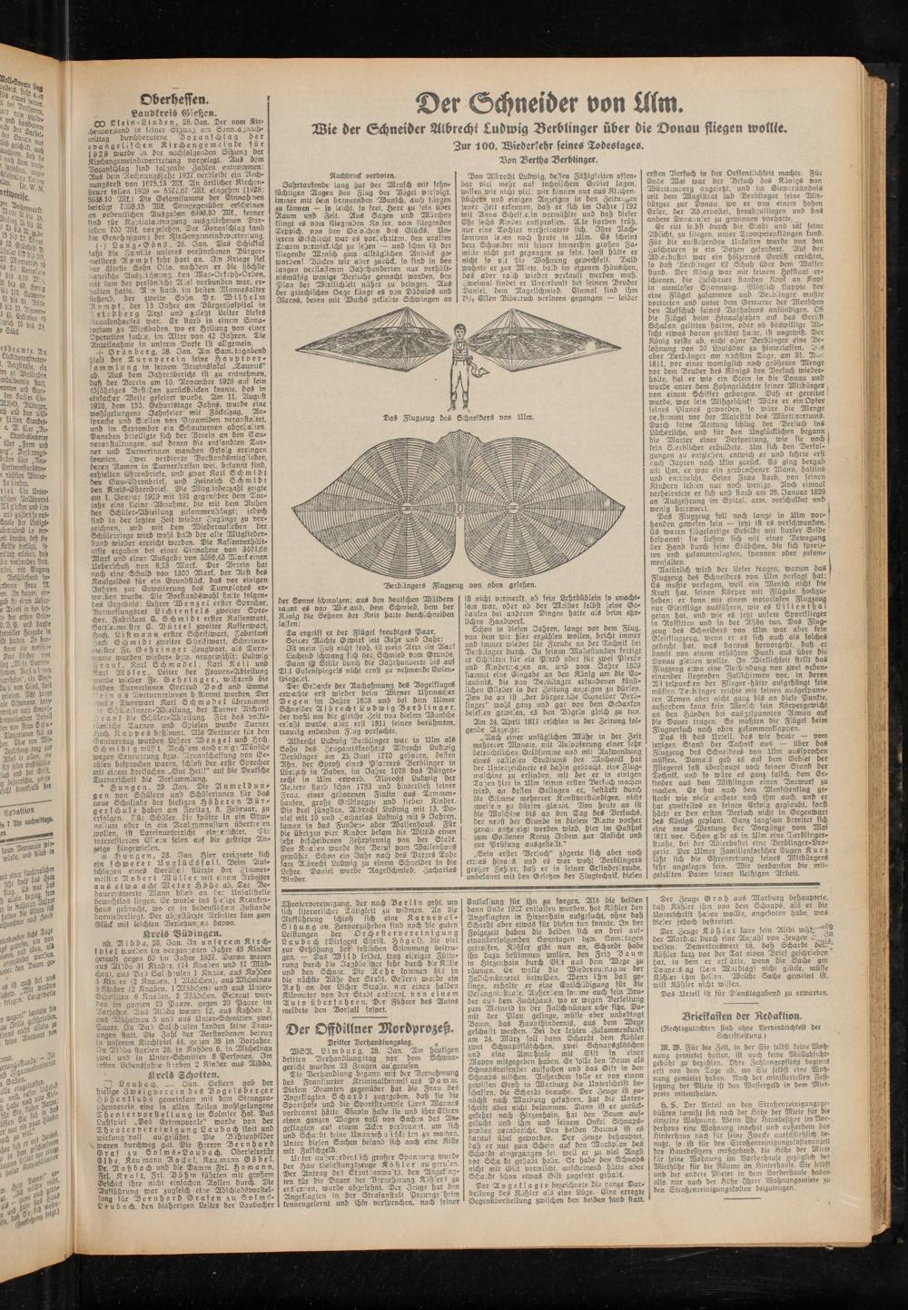 „Aach einer unsäglichen Mühe in der Zeit mehrerer Monate. mit Ausopferung einer sehr beträchtlichen Geldsumme und mit Aufwendung eines rastlosen Studiums der Mechanik hat der Unterzeichnete es dahin gebracht, eine Flug- maschine zu erfinden, mit der er in einigen Tagen hier in Ulm feinen ersten Versuch machen wird, an dessen Gelingen er, bestärkt durch die Stimme mehrerer Kunstverständigen, nicht zweite n zu dürfen . glaubt. Bon heute an ist die Maschine bis an den Tag des Versuchs, der neost der Stunde in diesem Blatte vorher genau antze eigt werden wird, hier im Gasthof zum Go.denen Kreuz Jedem zur Ansicht und zur Prüfung ausgestellt."