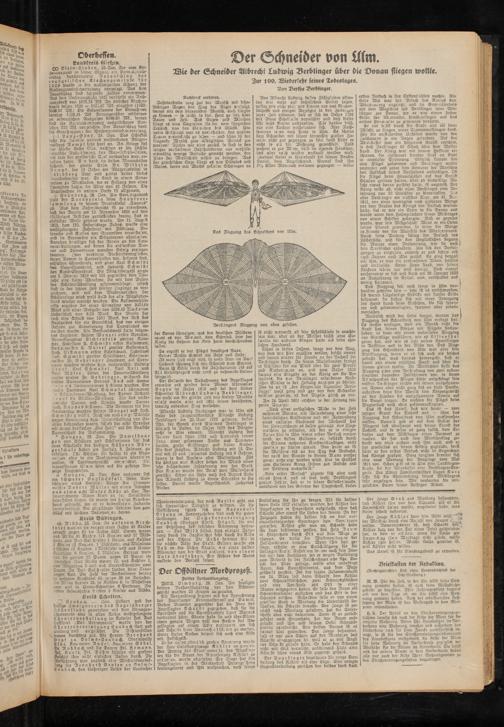 Der Gedanke der Aachahmung des Vogettluges erwachte erst wieder beim Wiener Uhrmacher Degen im Jahre 1828 und bei dem Ulmer Schneider Albrecht Ludwig Berblinger. Der wohl um dir gleiche Zeit von diesem Wunsche ersaßt wurde, aber erst 1811 seinen berühmten, traurig endenden Flug versuchte.