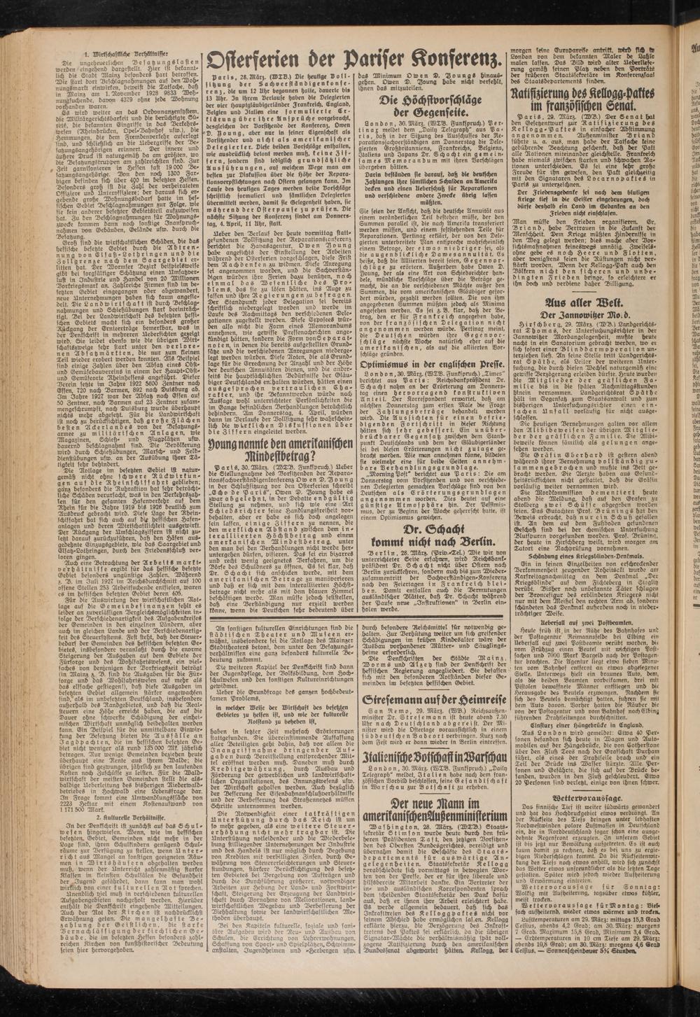 Sie seien der Ansicht, daß die deutsche Annuität aus einem veränderlichen Teil bestehen müsse, der den Summen parallel ist, die nach Amerika transferiert werden müssen, und einem feststehenden Teile für Reparationen. Pertinax erklärt, der von den Delegierten unterbreitete Plan entspreche wahrscheinlich einem Betrage, der etwas niedriger sei, als die augenblickliche Dawesannuität. Es heiße, daß die Alliierten bereit feien, Gegenvorschläge zu erörtern. Außerdem habe Owen D. Doung, der als eine Art von Schiedsrichter handele, mündliche Vorschläge über die Betrage gemacht, die an die verschiedenen Mächte außer den Summen, die vom amerikanischen Gläubiger gefordert würden, gezahlt werden sollten. Die von ihm angegebenen Summen müßten jedoch als Minima angesehen werden. Es sei z. B. klar, daß der Betrag, den er für Frankreich angegeben habe, von der französischen Delegation nicht angenommen werden würde. Pertinax meint, die Deutschen würden ihre Gegenvorschläge nächste Woche natürlich eher auf die amerikanischen, als auf die alliierten Vorschläge gründen.