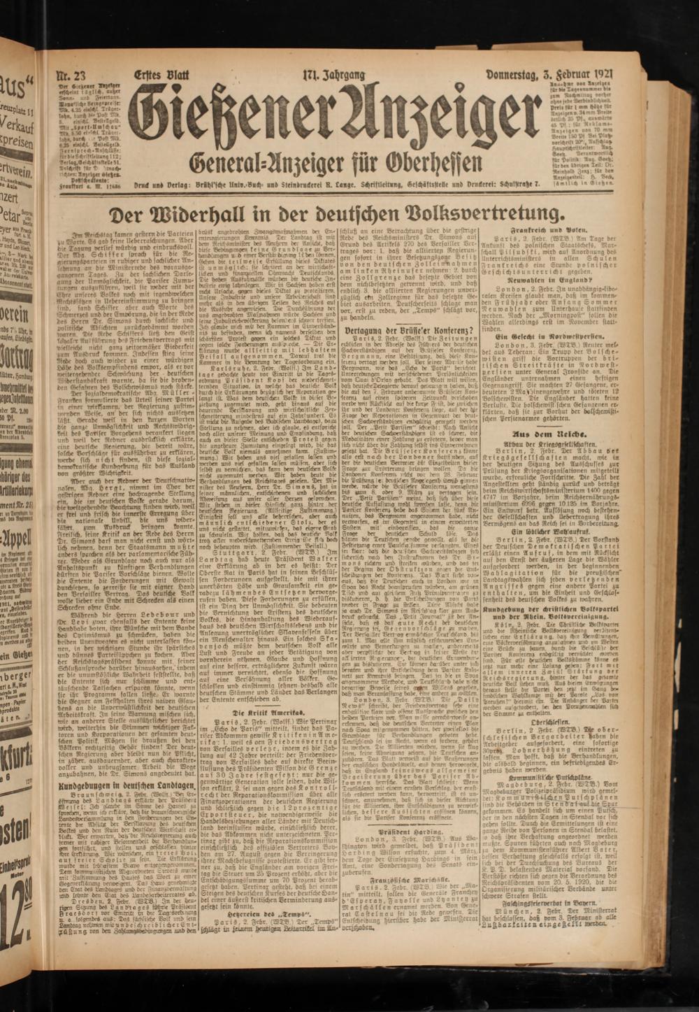 Erster Blatt 171. Jahrgang Donnerstag, 3. $ebniar 1921