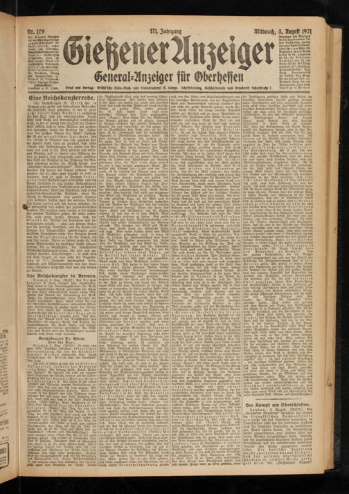 5. AllgUfi 1921 liieret »oi iRjfleei für bie lagtenummrr dtp zum Nachm Naq vorheK ohne jede verdlndUchkett. Breil für I mm höh« für Injetgen o 34 mm Brett« örtlich 40 <P1, ou.wLrt, 50 Df.; für 91 »hlam«« Anzeigen von 70 mm Breite 180Di v«' Platz« vorlchrrfl 20Aufschlag. ^auptschriftieNer: ?luq, Goetz Verantwortlich für Politik: Aug. Goetz; für den übrigen Teil: Dn Bemholb Ienz; für bett Anzeigenteil: Hans Beck, sämtlich in Bietzen