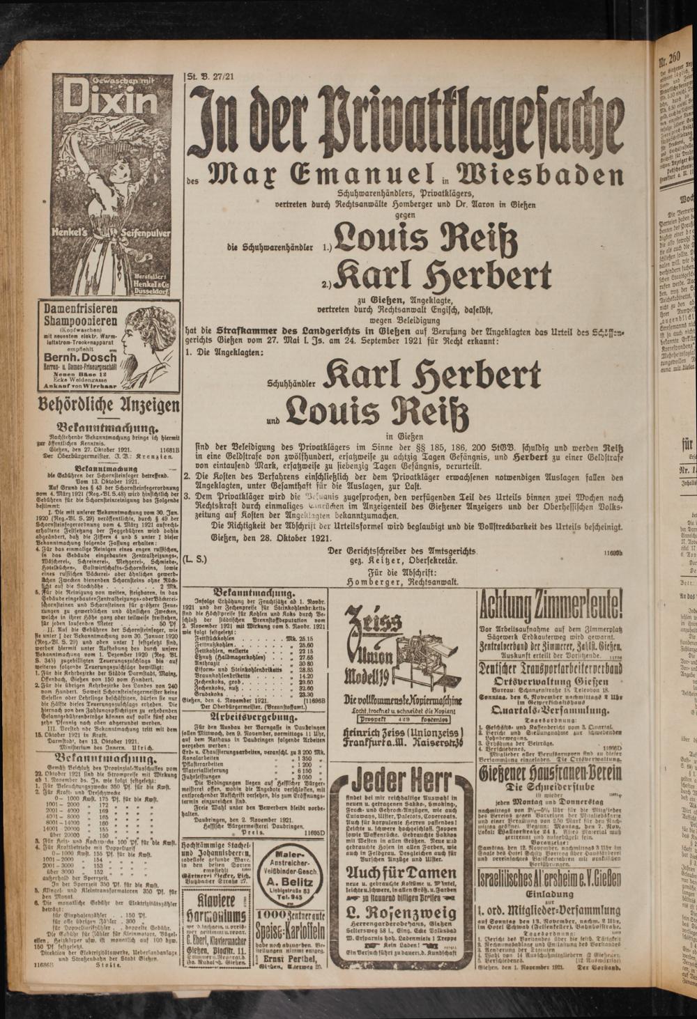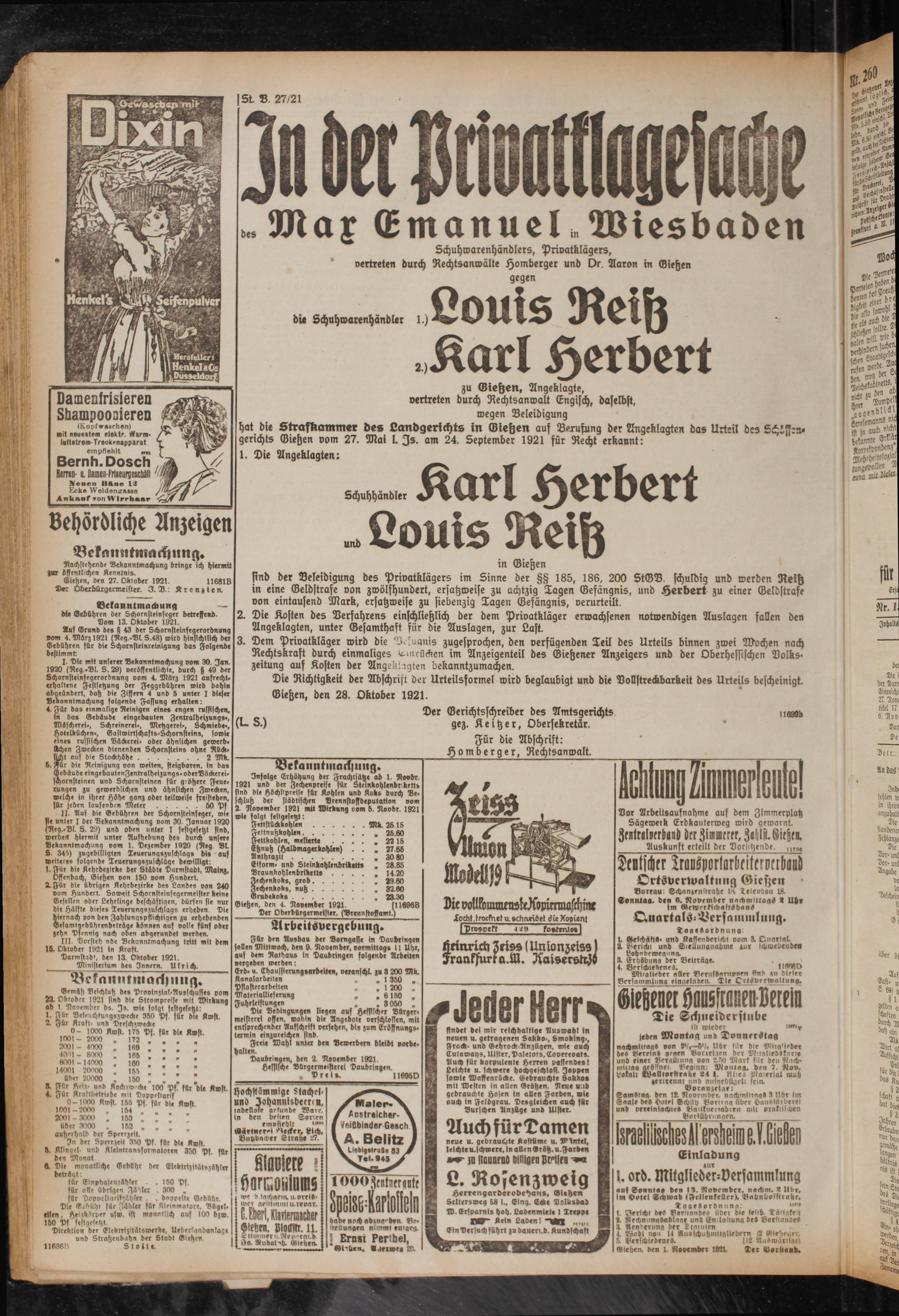3. Dem Privatkläger wird die °3<<uqms zugesprochen, den verfügenden Teil des Urteils binnen zwei Wochen nach Rechtskraft durch einmaliges ^-mruAen im Anzeigenteil des Gießener Anzeigers und der Oberhessischen Volkszeitung auf Kosten der Angeklagten bekanntzumachen.