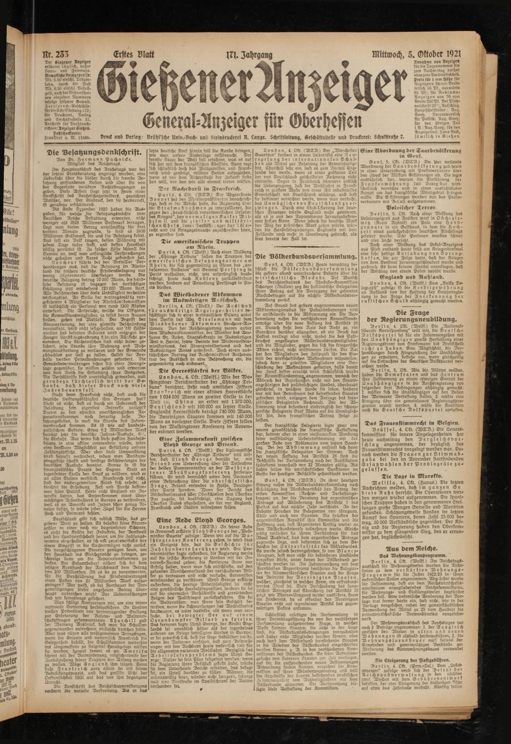 Der Gießener Anzeiger erscheint täglich, außer Sonn- und Feierioos. Monatliche vetugspreise: MK. 5.50 einschl. Träger- lohn, durch die Post Mk. 6.50 einschl. Bestell- gelb, auch bei Nichterscheinen einzelner Nummern infolge höherer Gewalt. Ferniprech-Anschlüsse: für die Schriftleitung 112; für Druckerei, Verlag und Geschäftsstelle 51. Anschrift für Drahtnach. richten: Anzeiger Sietzen.