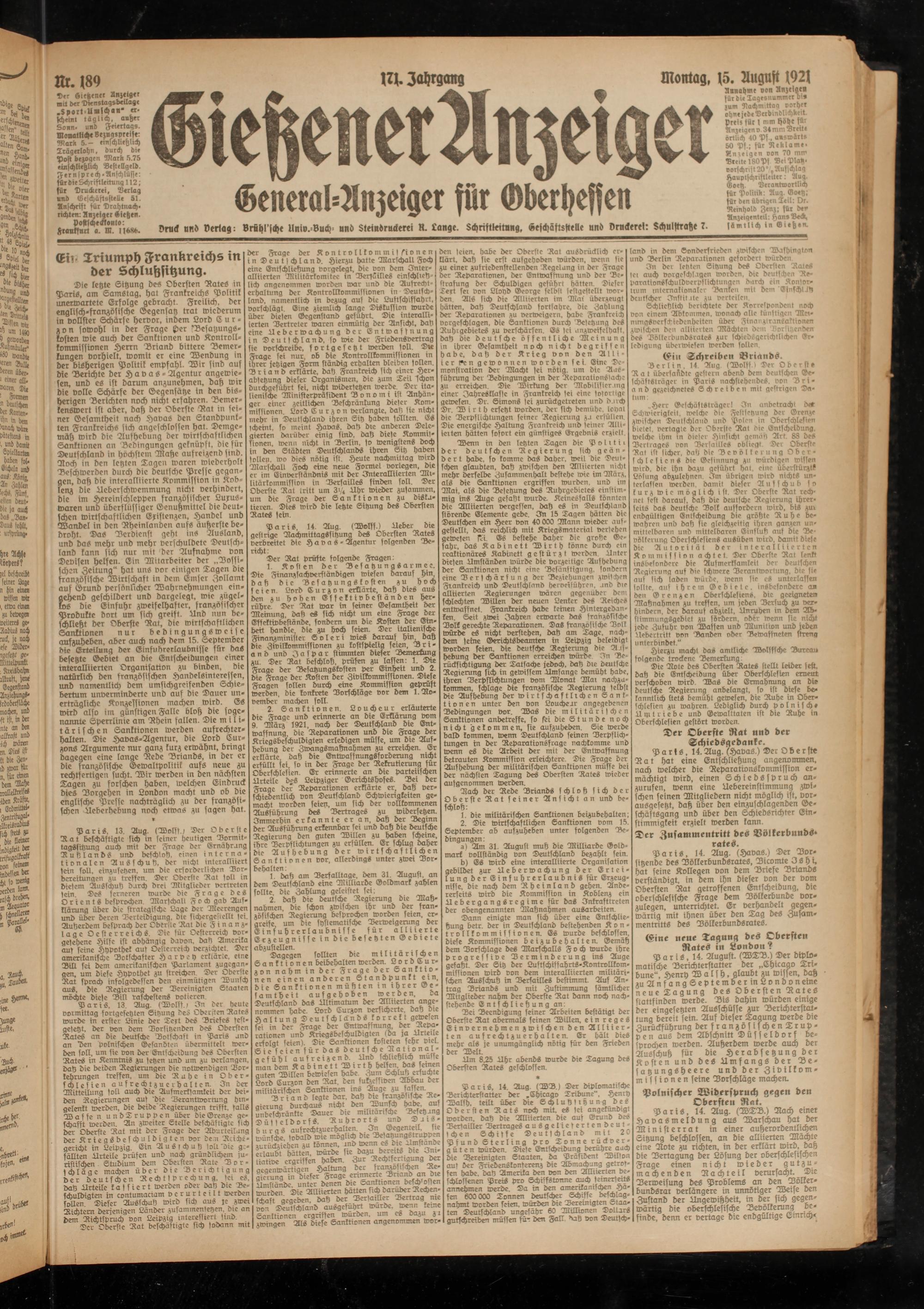 15. August (921 Annahme von Anzeigen für die Tagesnummer bi« zum Dachnnttaa vorher ohne jede Verbindlichkeit. Vreir für 1 mm höbe für Anzeigen v 34mm Breit« örtlich 40 Pf., auswärts 50 Pf.; für Reklame. Anzeigen von 70 mm Breite 180Pf Bei Platz, vorfchrist 20’ 9Aufschlag Hauptschristletter: Aug. Goetz Verantwortlich für Politik: Aug. Goetz, für bin übrigen Teil: Dr. Reinhold Zenz; für den Anzeigenteil: Han» Beck, sämtlich in Gießen.