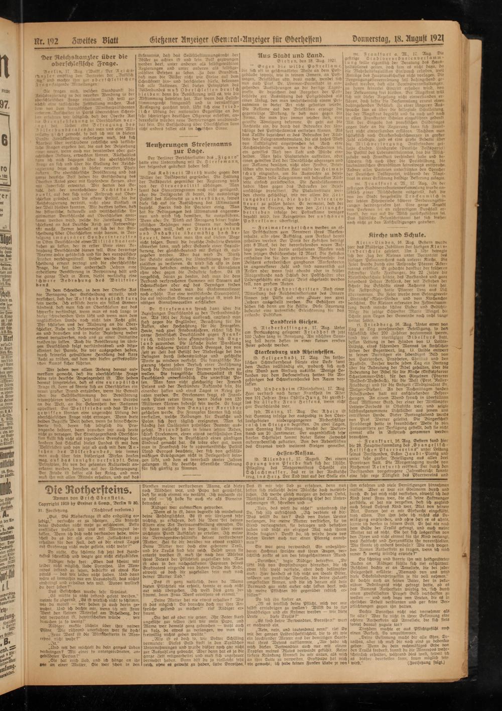 Hr. |92 Zweites Blatt Gießener Anzeiger (Gemral-Anzeiger für Oberhessen) Donnerstag, 18. August 1921