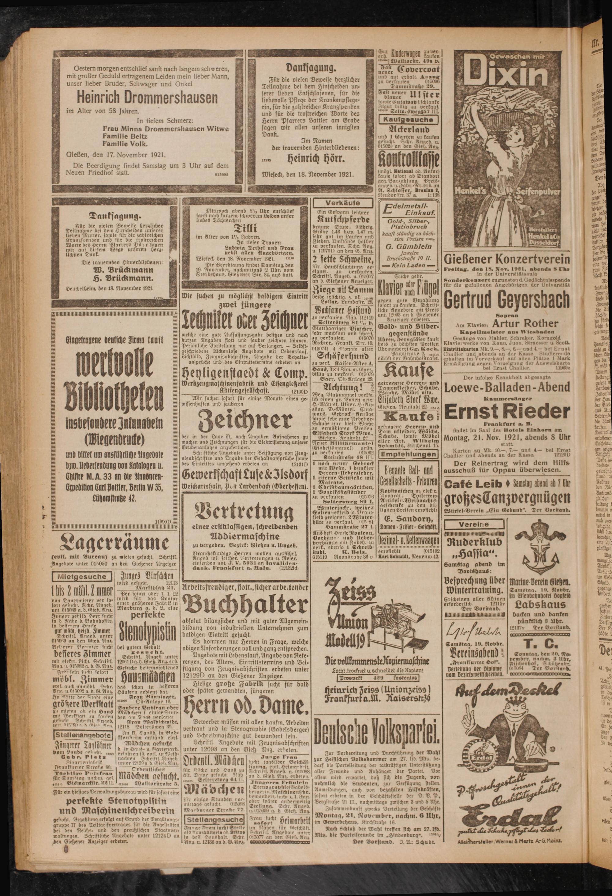 Ludwig Deibel und HFrau nebft allen Angehörigen. Wieseck, den 18. November 1921. u,,e Die Beerdigung findet Samstag, den 19. November, nachmittags 2 Uhr, vom Sterbebaus, ©ieüencr Str. 34, agS statt.