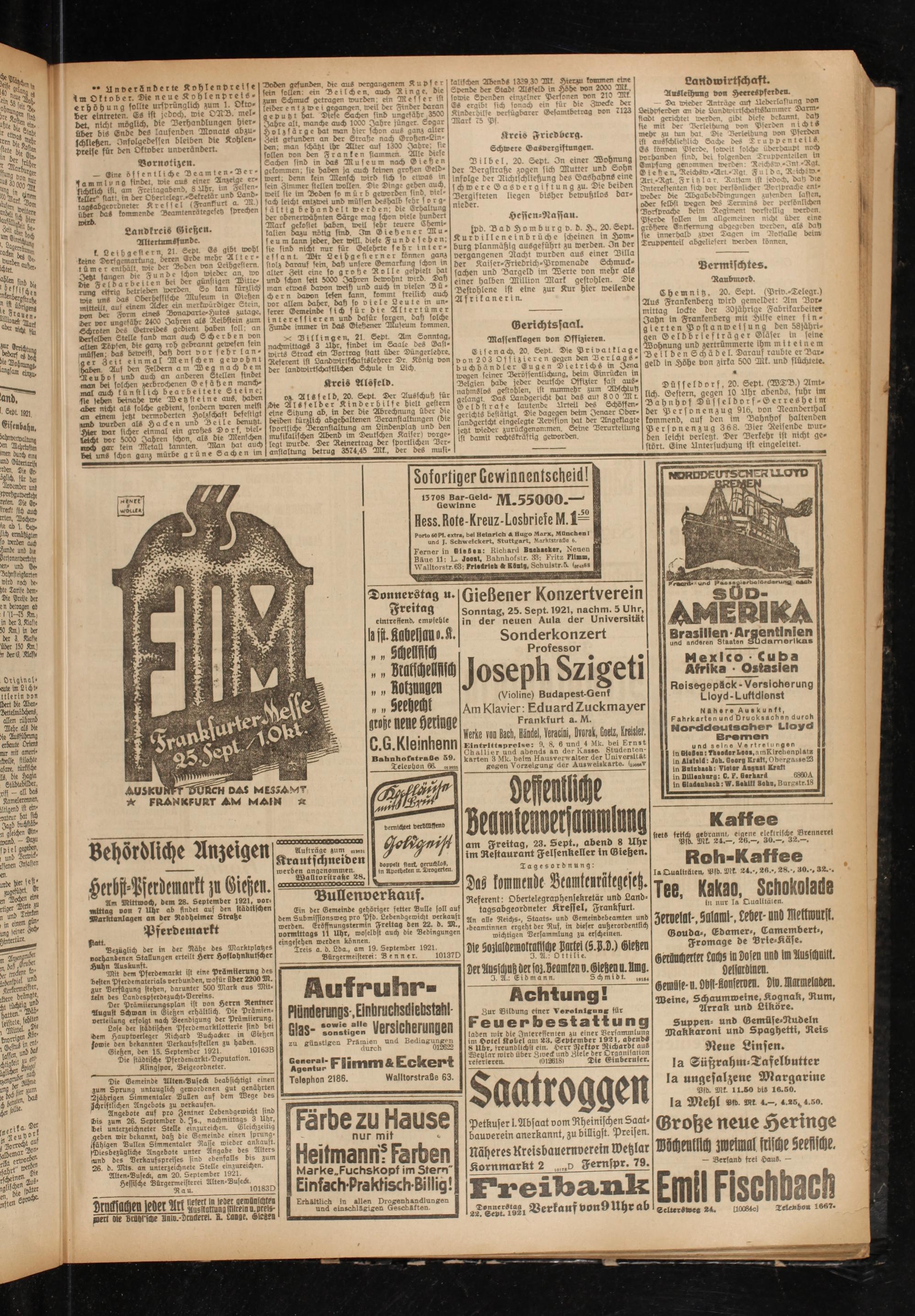 Am Mittwoch, dem 28. September 1921, vor. nüttag von 7 Uhr ab findet auf den städtischen Startanlagen an der Rodheimer Straße