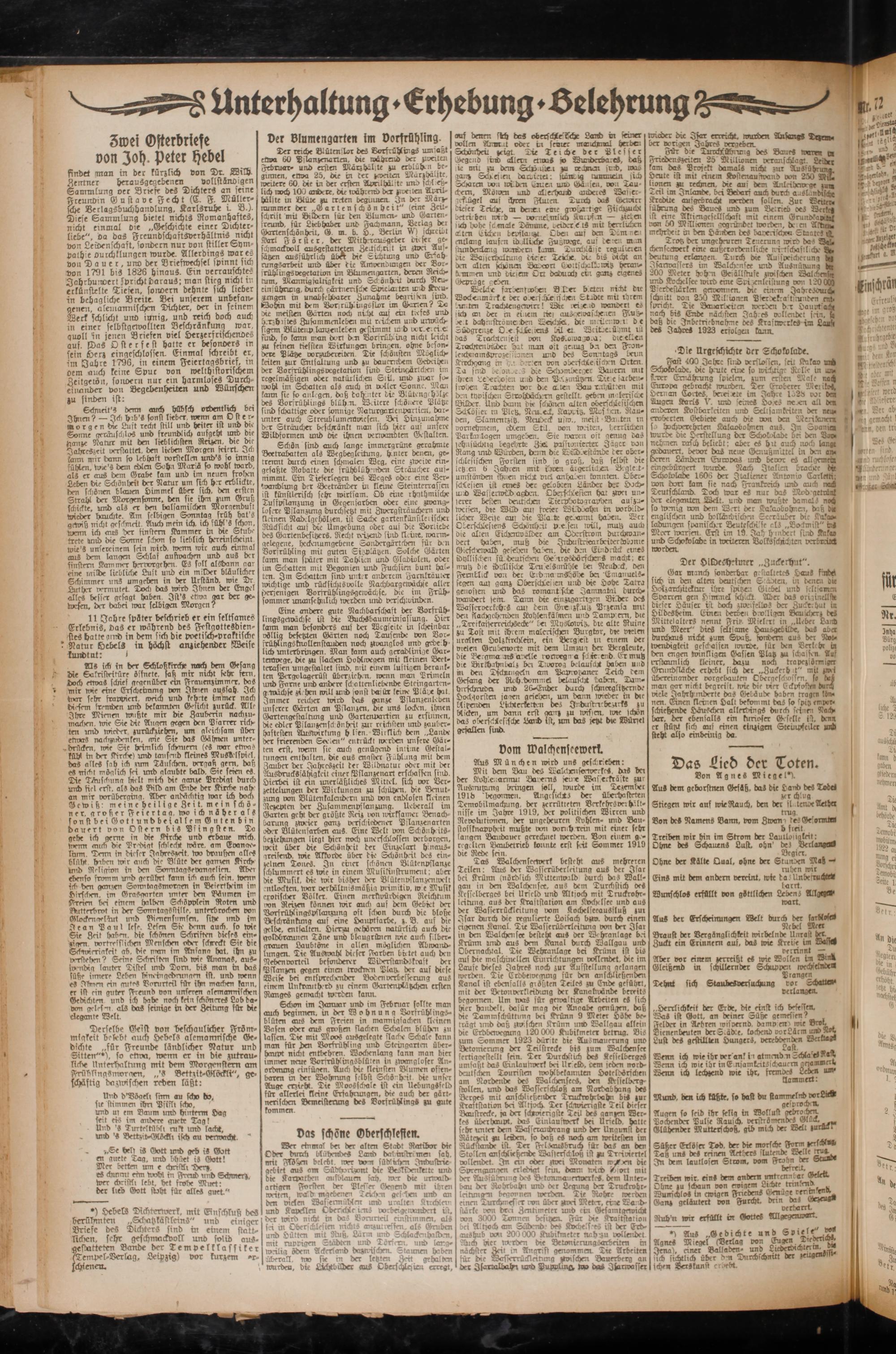 Zwei Gfterdriefe von )oh. Peter Hebel findet man in der kürzlich von Dr. Milh. Zentner herausgegedencv vollständigen Sammlung oer Briefe des Dichters an seine. Freundin Gustave Fecht (C. F. Müller- sche Verlagsbuchhandlung, Karlsruhe L B.). Diese Sammlung bietet nichts Romanhaftes, nicht einmal die „Geschichte einer Dichter- liebe", da das Freundschaftsverhältnis nicht von Leidenschaft, sondern nur von stiller Sympathie ourchklungen wurde. Allerdings wares von D a u e r, und der Briefwechsel spinnt sich von 1791 bis 1826 hinaus. Ern verrauschtes Jahrhundert spricht daraus; man stieg nicht in erkünstelte Diesen, sorwern dehnte sich lieber in behagliche Breite. Bei unserem unbefan, aenen, alemannischen Dichter, der in seinem Werf schlicht und innig, und reich doch auch in einer selb st gewollten Beschränkung war, quoll in jenen Briefen viel herzerfrischendes auf. sDas Osterfest hatte er besonders m sein Herz eingcschlossen. Einmal schreibt er, im Jahre 1796, in einem Feiertagsbrief, in dem auch keine Spur von welthistorischem Zeitgetön, sondern nur em harmloses Durcheinander von Begebenheiten und Wünschen zu finden ist: