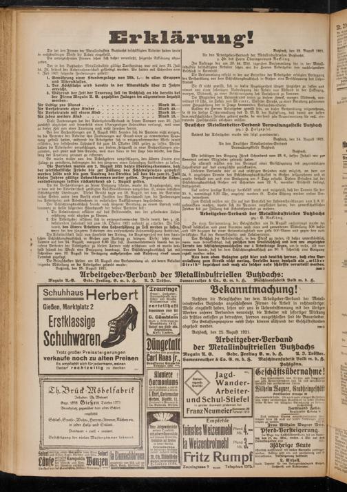 Der in der Butzbacher Metallindustrie gültige Tarifvertrag war mit dem 31. Juli ds. Js. seitens der Arbeitnehmerschaft gekündigt worden. Sie hatten mit Schreiben vom 8. Juli 1921 folgende Forderungen gestellt: