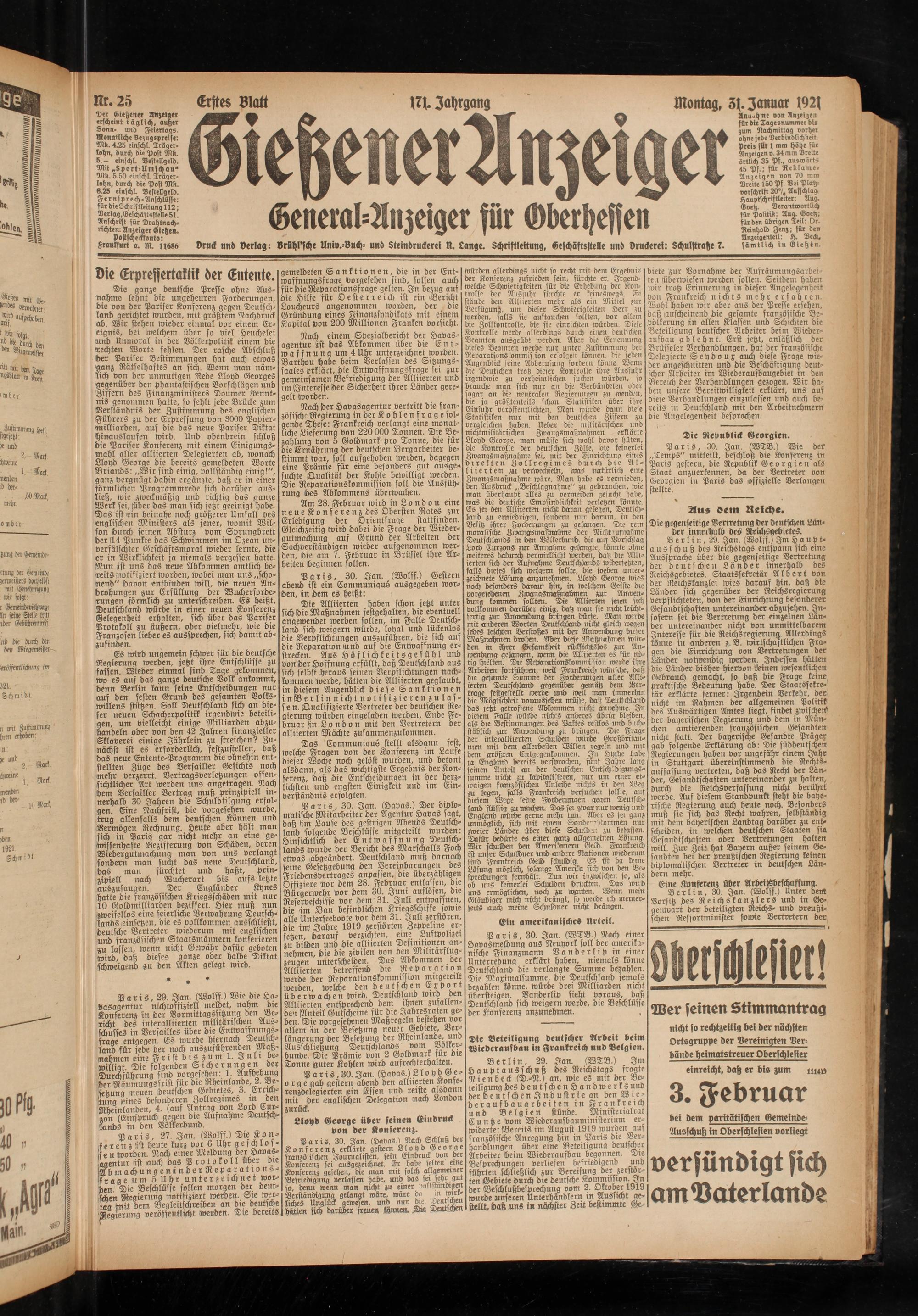 vruck und Verlag: vrühl'sche Univ. Such- und Steindruckerei H. Lange. Schriftiettung, Geschäftsstelle und Druckerei: Schulstrahe 7. sämtlich in Gießtn