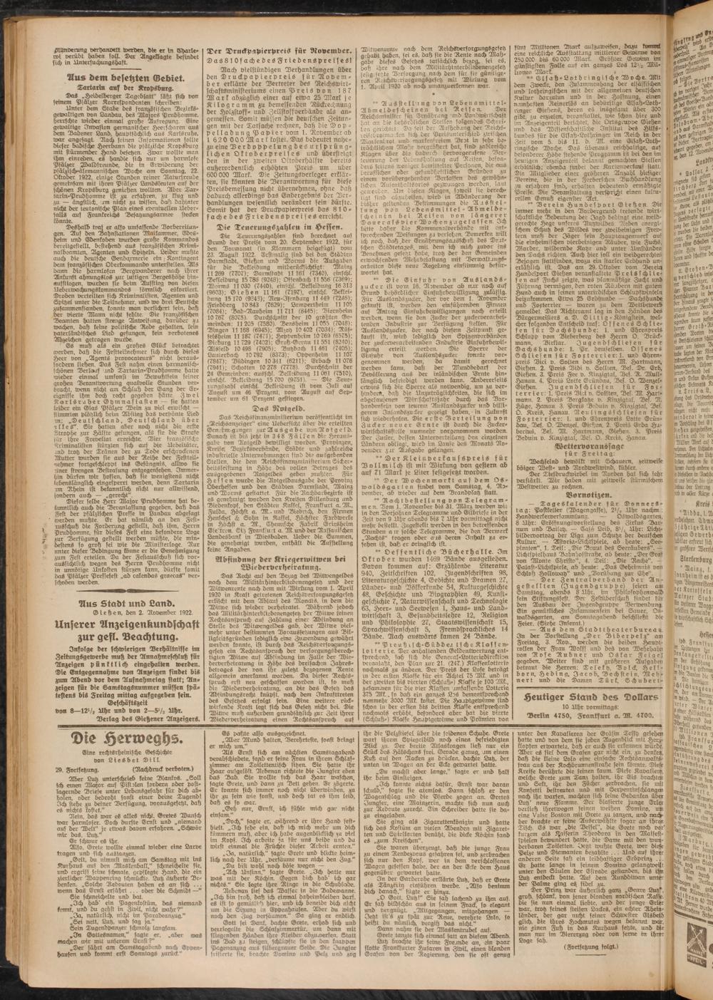 Die Teuer: imgszah len sind berechnet auf Grund der Preise vom 20. September 1922, für den Vormonat (in Klammern beigefügt) vom 23. August 1922. Erstmalig sind bei den Städten Darmstadt, Gießen und Worms die Ausgaben für die Bekleidung mitberücksichtigt: Mainz 11 269 (7707); Darmstadt 11 161 (7340), einschl. Bekleidung 15 785 (9248); Offenbach 11 556 (7369); Worms 11 030 (7440), einschl. Bekleidung 16 313 (9603); Giehen 11161 (7197), einfchl. Bekleidung 15 170 (9343); Reu-Isenburg 11 449 (7246); Friedberg 10 843 (7629); Lampertheim 11 105 (7084); Bad-Nauheim 11 711 (8445); Viernheim 10 767 (8075). Durchschnitt der 10 grössten Gemeinden : 11205 (7580). Bensheim 11 055 (7048): Bingen 11 168 (6945); Alzey 10 402 (7034): Rüsselsheim 11 187 (7471); Hepvenheim 10 769 (6575); Dicburg 11 729 (7402); Groß-Gerau 11551 (8240); Alsfeld 10 498 (7905); Butzbach 11 461 (7405); Lauterbach 10 792 (8373); Oppenheim 11107 (7847); Büdingen 10 341 (6211): Erbach 11076 (7941); Schotten 10 278 (7778). Durchschnitt der 24 Gemeinden: ausschl. Bekleidung 11 061 (7510), einschl. Bekleidung 15 700 (9751). — Die "Sette- rungszahl einschl. Bekleidung ist vom Juli auf August um 46 Prozent, vom August auf September um 61 Prozent gestiegen.