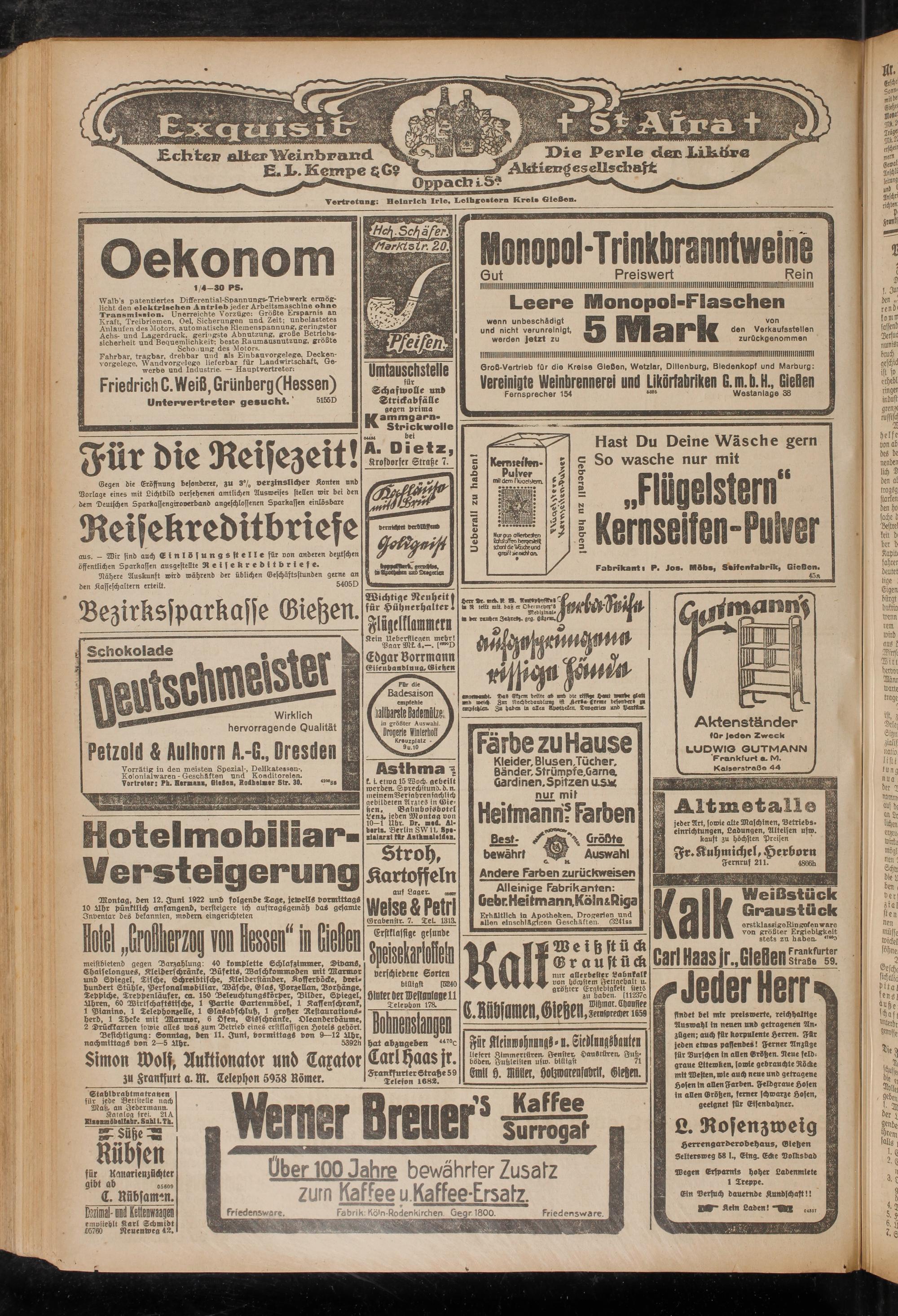 Botel „Mherzog von Bussen“ io Gießen meistbietend gegen Barzahlung: 40 komplette Schlafzimmer, DivanS, Ehaiselongues, Kleiderschränke, Büfetts, Waschkommoden mit Marmor und Spiegel, Tische, Schreibtische, Kleiderständer, Kvfferbücke, drei- hurrdert Stühle, Personalmvbiliar, Wäsche, GlaS, Porzellan, Vorhänge, Teppiche, Treppenläufer, ea. 150 Beleuchtungskörper, Bilder, Spiegel, Ähren, 60 Wirtschaftstische, 1 Partie Dartenmöbel, 1 Kafsenschrank, 1 Pianino, 1 Telephonzelle, 1 VlaSabschluh, 1 großer Restaurattons- herd, 1 Theke mit Marmor, 6 Öfen, Eisschränke, Oleanderbäume, 2 Drückkarren sowie alles was zum Betrieb eines erstklaffigen Hotels gehört.