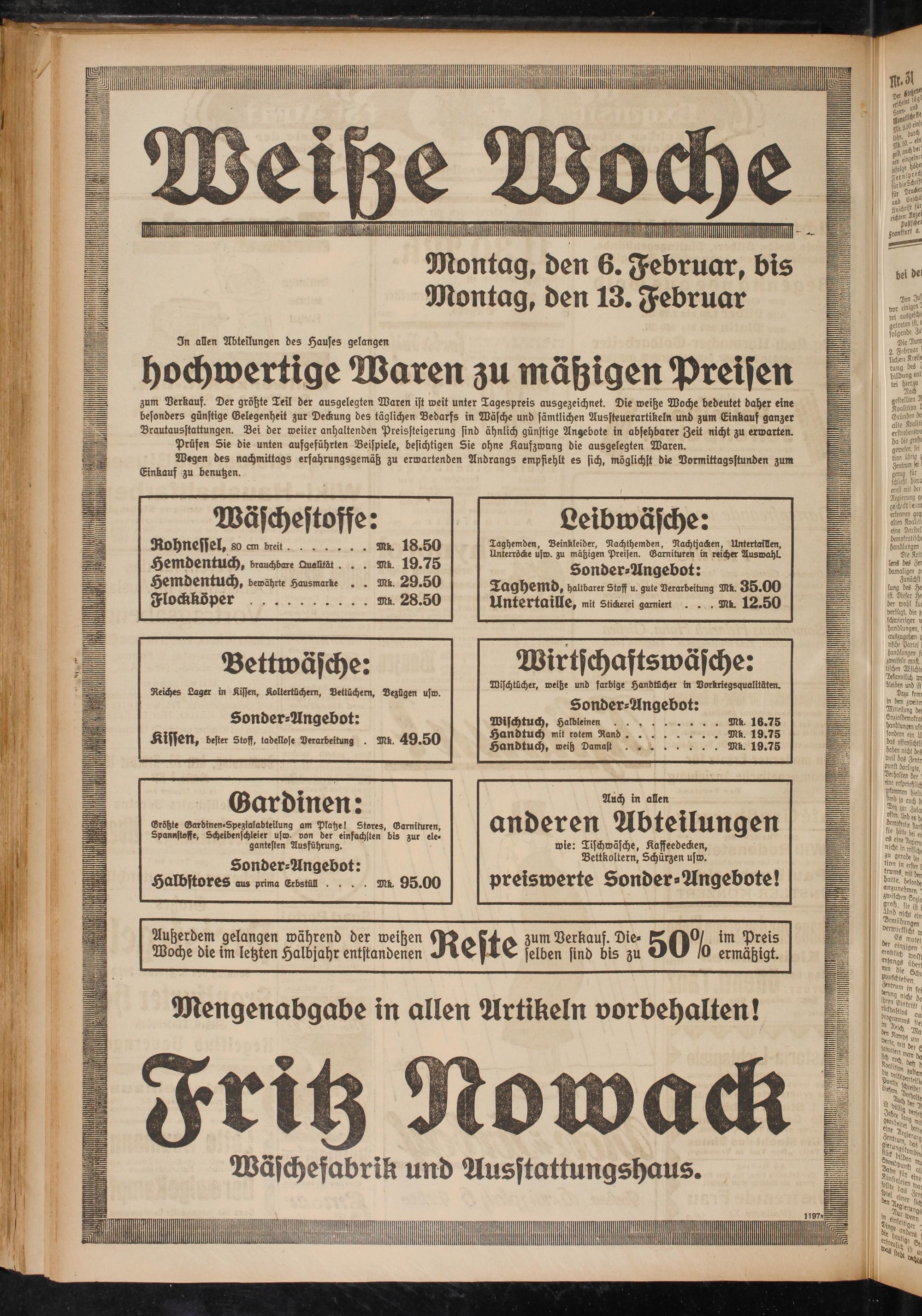 hochwertige Waren zu mäßigen Preisen zum Verkauf. Der größte Teil der ausgelegten Waren ist weit unter Tagespreis ausgezeichnet. Die weiße Woche bedeutet daher eine besonders günstige Gelegenheit zur Deckung des täglichen Bedarfs in Wäsche und sämtlichen Aussteuerartikeln und zum Einkauf ganzer Brautausstattungen. Bei der weiter anhaltenden Preissteigerung sind ähnlich günstige Angebote in absehbarer Zeit nicht zu erwarten.