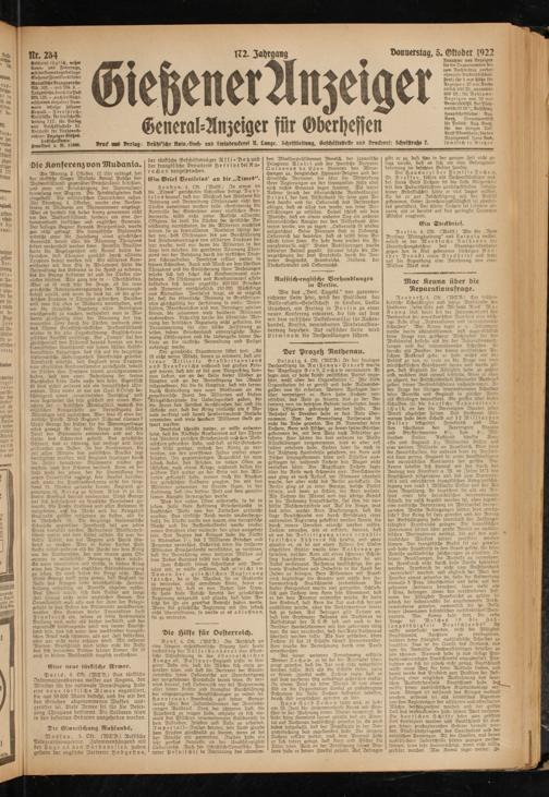 Erscheint täglich, trnfeer Sonn« und Feiertags, Btt derSamstagsbeilage: GiehenerFamilienblätter Monatliche vezuqrprehe: Mk 102.- undMK. 8. - Trägerlohu,durch die Post Mk 125. - .auch beiRicht- erscheinen einzelner Rum. mern infolge höherer Gewalt - Fernsprech. Anschlüsse: für die Schrift, ieitung 112; für Verlag nnd Geschäftsstelle 51. Anschrift für Drahtnach. richten: Anzeiger Stetze».