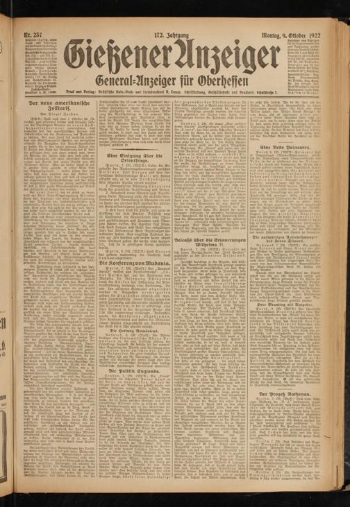 Annahme von Anzeigen für die Tagesnummer bis zum Nachmittag vorher ohnejede Verbindlichkeit. Preis für 1 mm höhe für Anzeigen v 27 mm Breite örtlich 400 Pf., auswärts 500 Pf.,- für Reklame- Anzeigen von 70 mm Breite I600Pf. Bei Platz Vorschrift 20 Aufschlag. Hauptfchriftleiter: Aug. Goetz. Verantwortlich für Politik. Aug. Goetz, für den übrigen Teil: Ernst Blumschein,- für den Anzeigenteil: Hans Beck, sämtlich in Gießen