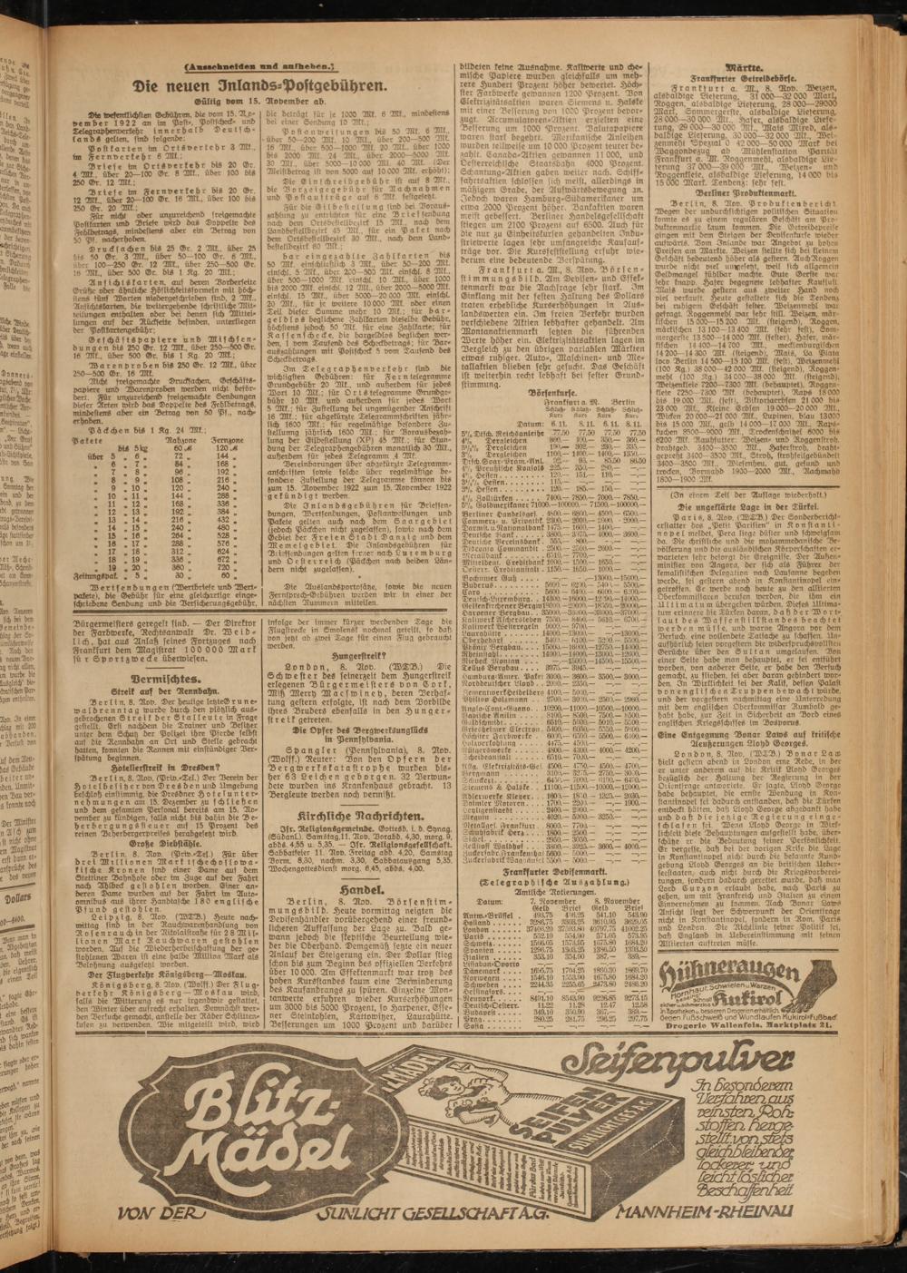 Die wesentlichsten Gebühren, die vom 15.Rovern ber 1922 an im Post-, Postscheck- und Telegraphenverkehr innerhalb Deutschland« gelten, sind folgende:
