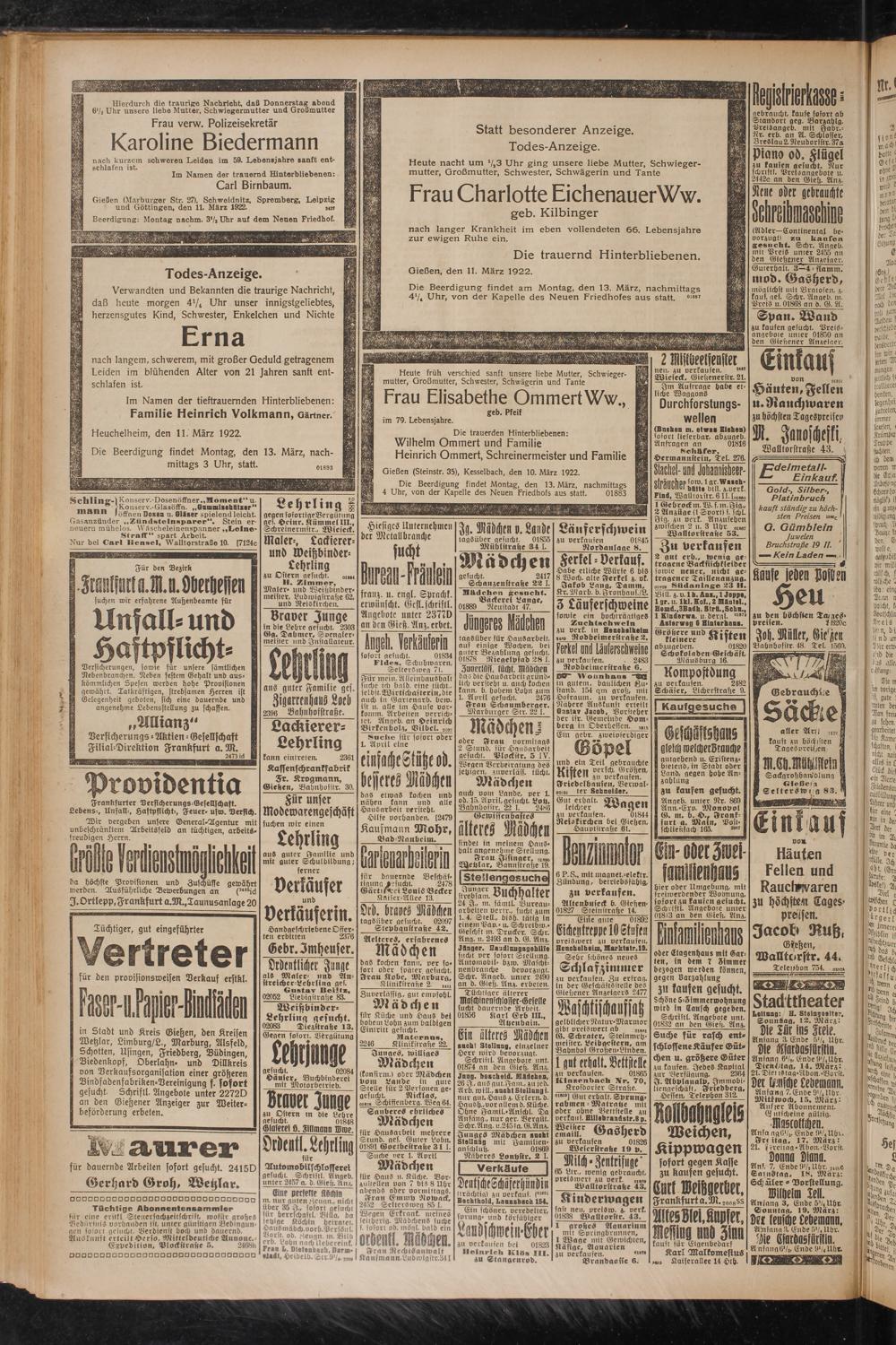 Gießen, den 11. März 1922. Die Beerdigung findet am
