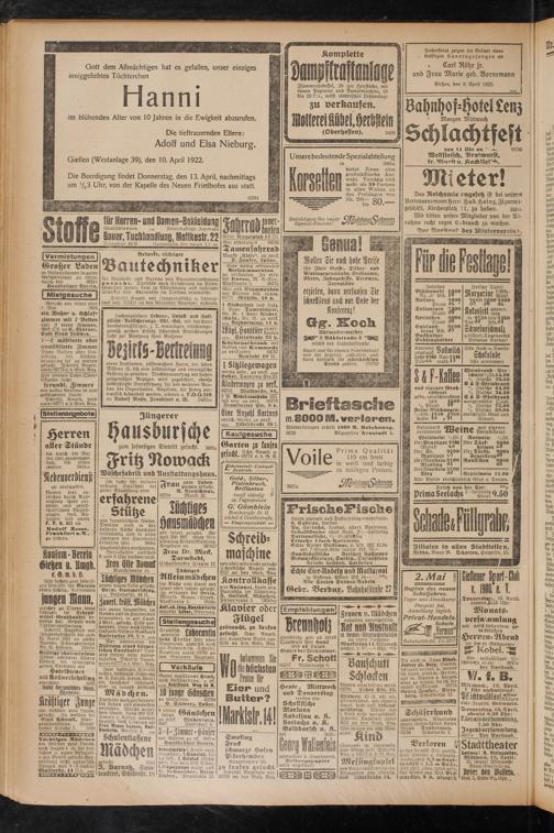 | Stellengesuche! gevrtiste iMsrMin sucht Stelle hier oder Uitigegend, zunächst auch als Bolontäritt. Schriftl. Angebote unter 03782 an den Gießener Anzeiger, f Veikäute | Guter wachsamer Hund, auch Gefliigeltreu. z. vk.