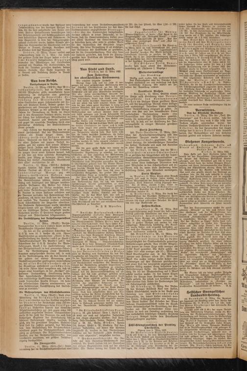 rm Darmstadt, 12. März. Die Beratungen begannen am Samstag unter dem Vorsitz des Präsidenten Dr. v. Diehl um 3/4g Ahr, nachdem Pfarrer Kleeberger das einleitende Gebet gesprochen hatte.