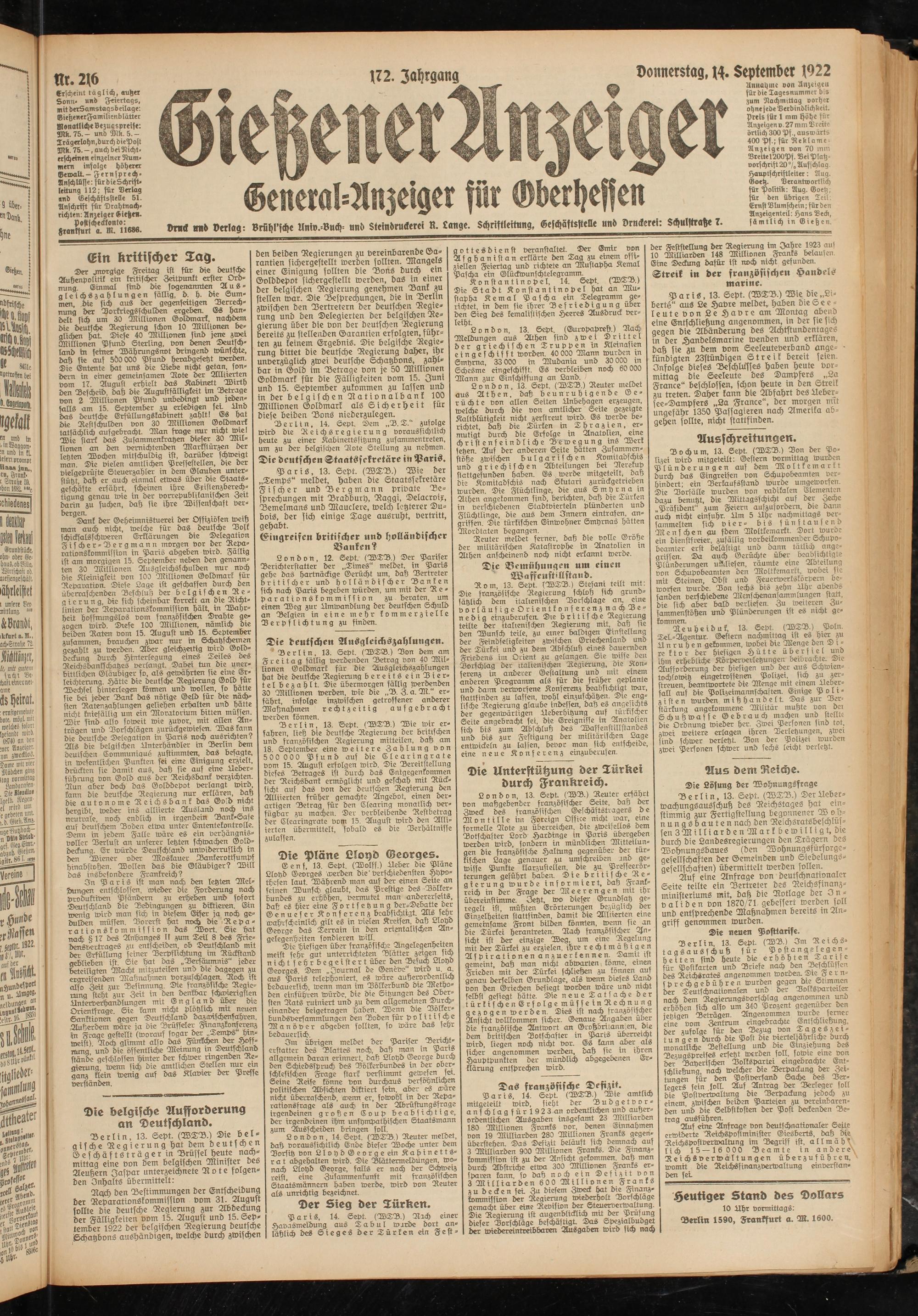 Annahme von Anzeigen für die Tagesnummer bis zum Nachmittag vorher ohnejede Verbindlichkeit. Preis für 1 mm höhe für Anzeigen v. 27 mm Breite örtlich 300 Pf., auswärts 400 Pf.; für Reklame Anzeigen von 70 mm Breitel200Pf. Bei Platz v orf christ 20 °/0 Aufs chlag Hauptfchriftleiter: Aug. Boetz. Verantwortlich für Politik: Aug. Goetz; für den übrigen Teil. Ernst Blumschein; für den Anzeigenteil: Hans Beck, sämtlich in Gießen.