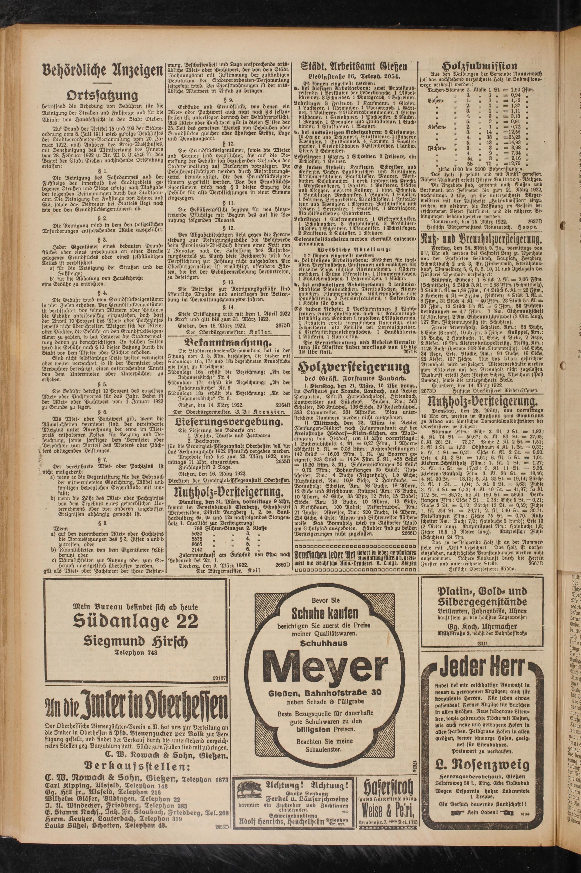 Auf Grund der Artikel 15 und 193 der Städte- vrdnung vom 8. Huli 1911 wird zufolge Beschlusses der Stadtverordneteir-Bersammlung vom 20. 3a- nuar 1922, nach Anhören des Kreis-Ausschusses, mit Genehmigung des Ministeriums des Innern vom 28. Februar 1922 zu Rr. M. d. 3. 4546 für den Bezirk der Stadt Gieften nachstehende Ortssahung erlassen: