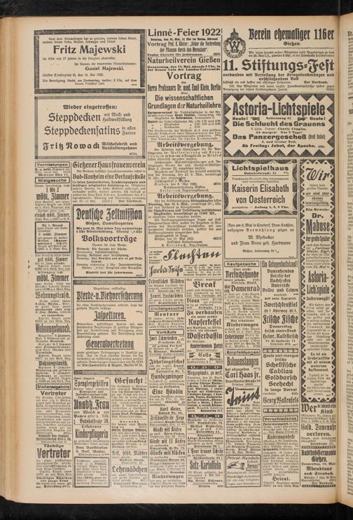 £3 Gießen (Lindenplatz 8), den 15. Mai 1922. kJ Die Beerdigung findet am Donnerstag, nachm. 3 Uhr, auf dem W Neuen Friedhof statt. oeio, K&