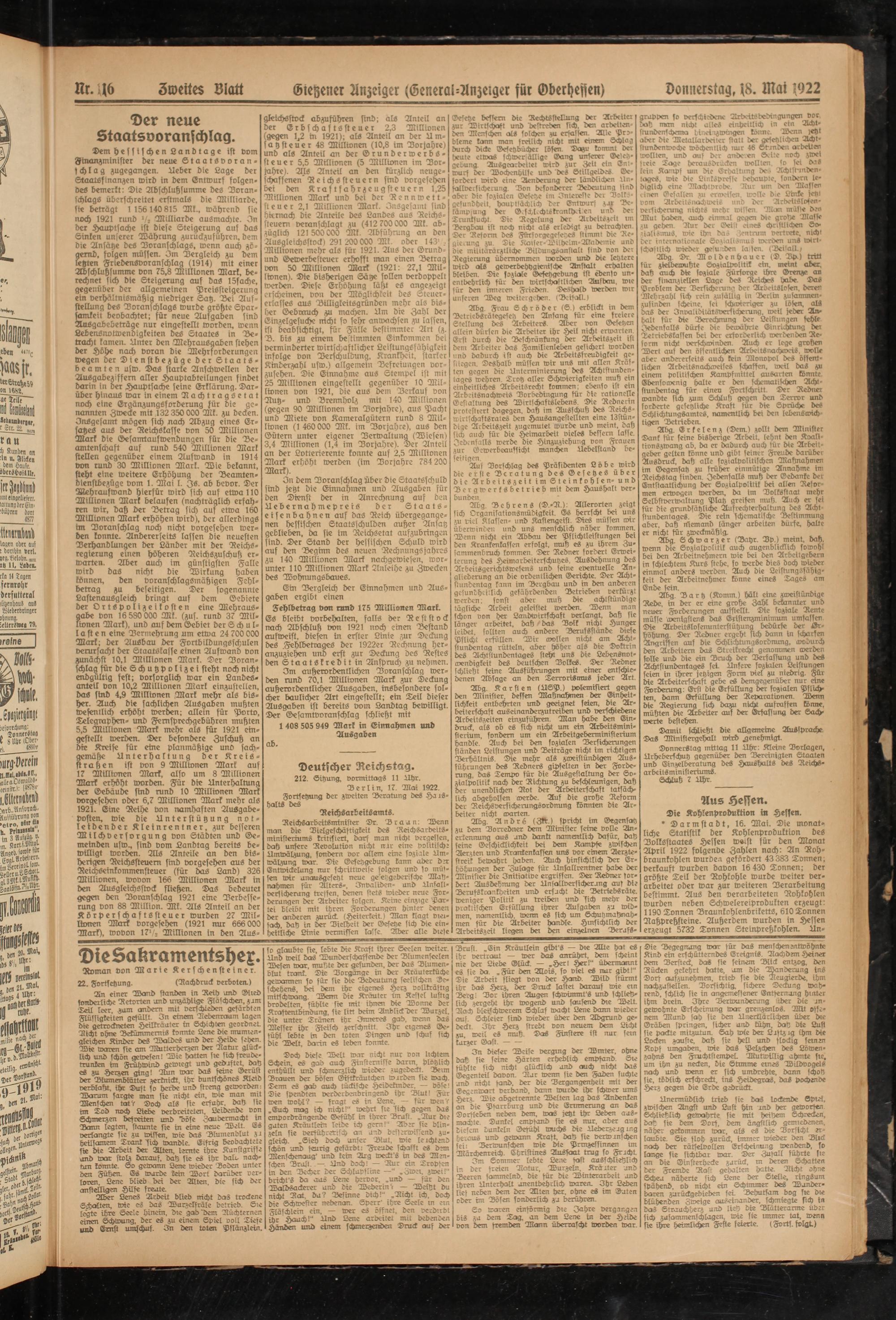 Nr. 16 Zweiter Blatt Gießener Anzeiger (General-Anzeiger für Gberhesfen)Donnerstag, (8. Mai -922