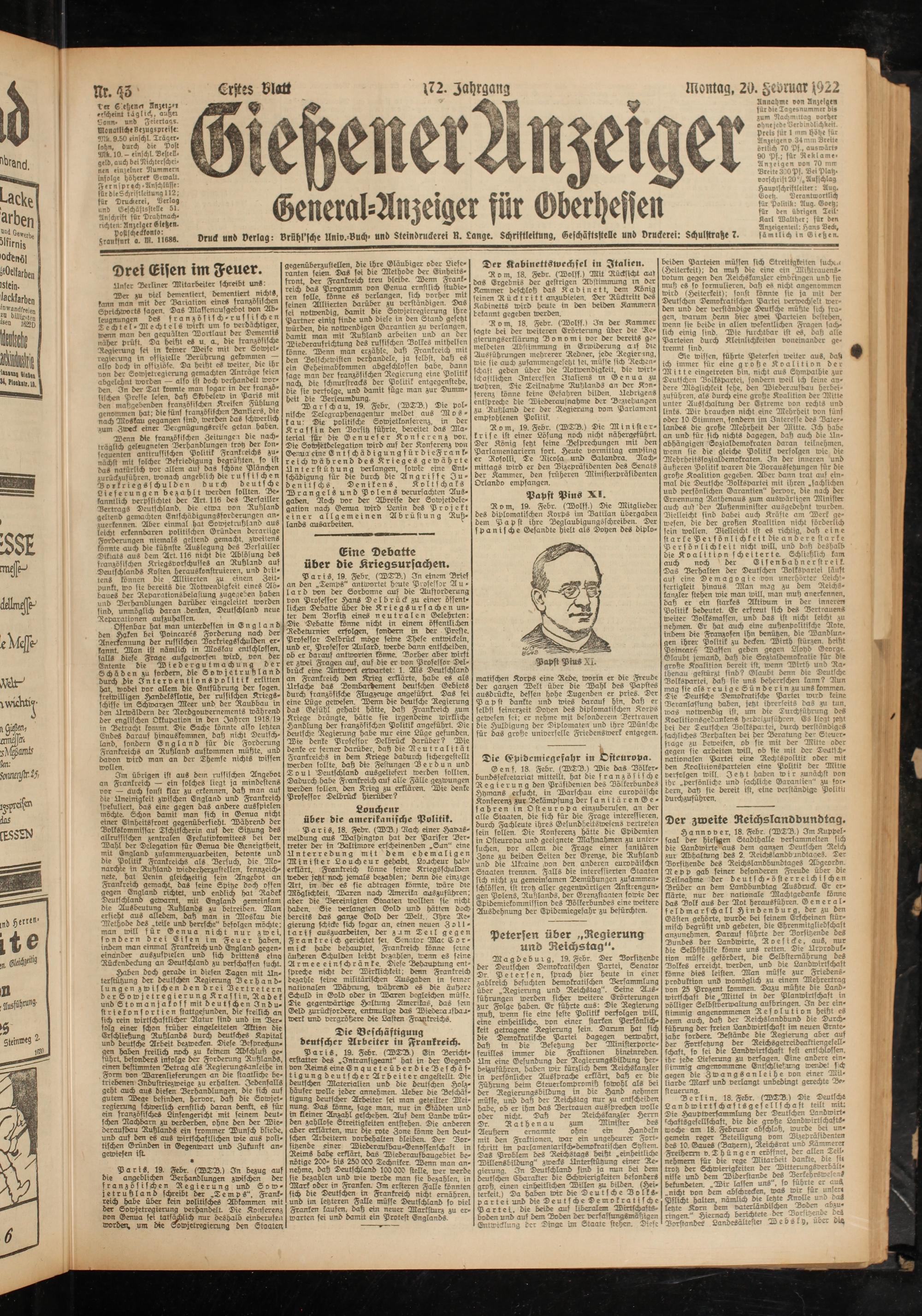 Erster Blatt (72. zahrgang montag, 20. §ci>niar 1922