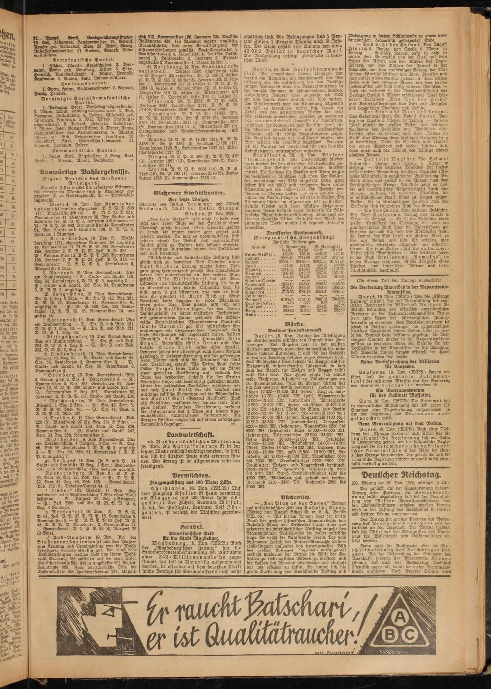 Mainz. D. S. P. D. 14 281 (23), D. D. P. 3458 (6). Dn. P. 2367 (4), Zentrum 10 786 (17), Demokraten 3196 (5), Kommunisten 1442 (3), Wirtschaftspartei 1125 (2).