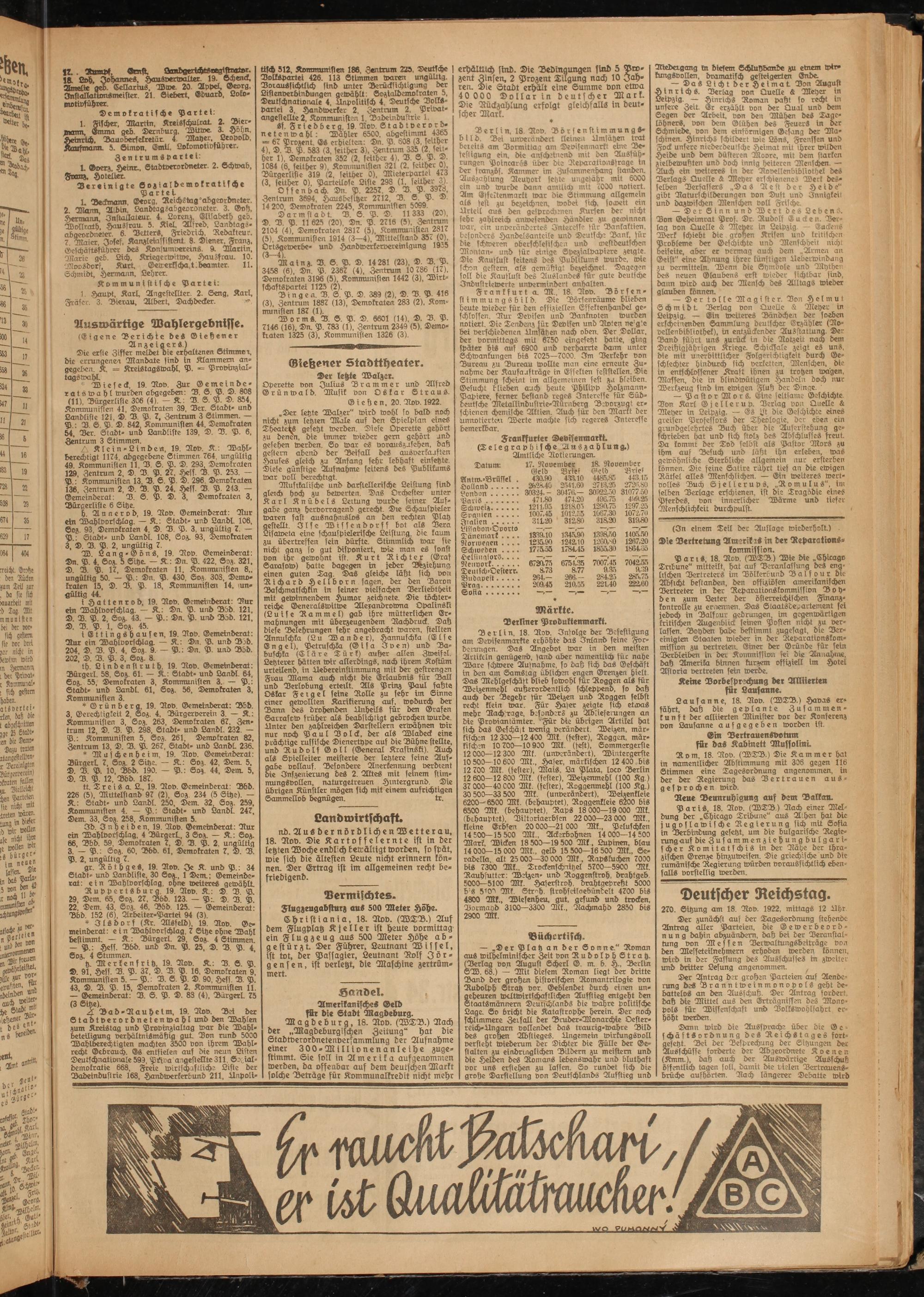 tz. Merkens ritz, 19. Rov. K.: D. S. P. D. 91, Hess. D. P. 37, D. D. P. 16, Demokraten 9, Kommunisten 5. — P.: D. S. P. D. 90, Hess. D. P. 43, D. D. P. 15, Demokraten 2. Kommunisten 11. — Gemeinderat: D. S. P. D. 83 (4), Dürgerl. 75 (3 Sitze).