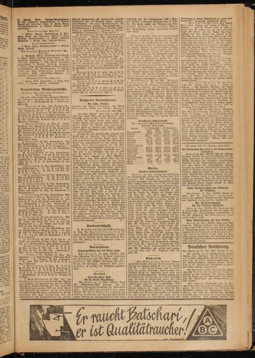 sf. Friedberg, 19. Rov. Stadtverord- netenwahl: Wähler 6500, abgestimmt 4365 — 67 Prozent. GS erhielten: Dn. P. 608 (3, seither 4), D. D. P. 583 (3, seither 3), Zentrum 335 (2, seither 1), Demokraten 352 (2, seither 4), D. S. P. D. 1084 (6, seither 9), Kommunisten 321 (2. seither 0), Dürgerliste 319 (2. seither 0), Mieterpartei 473 (3, seither 0), Parteilose Liste 298 (1, seither 3)