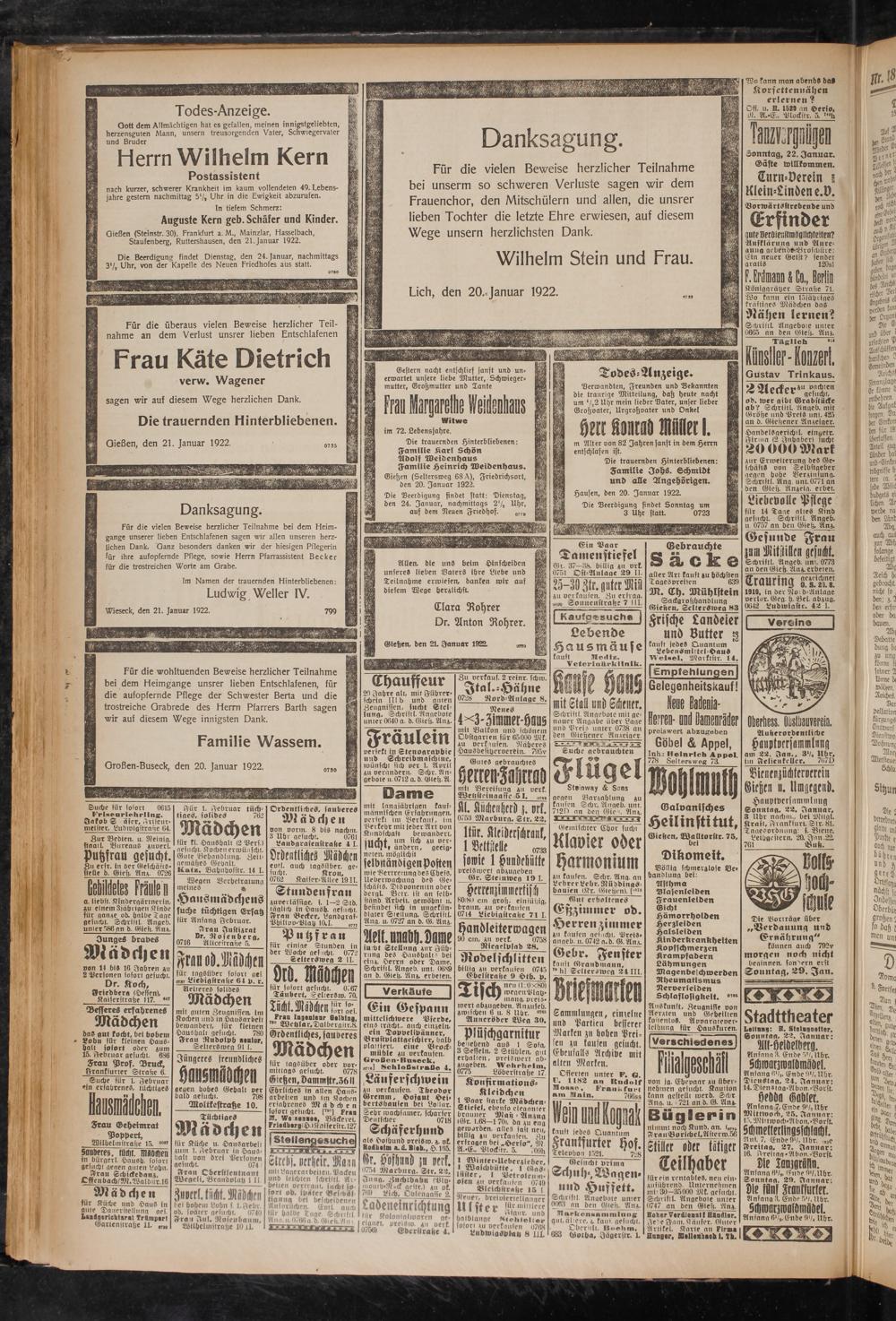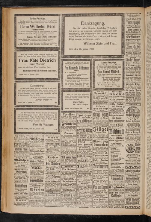 Gießen (Steinstr. 30), Frankfurt a. M., Mainzlar, Hasselbach, Staufenberg, Ruttershausen, den 21. Januar 1922.