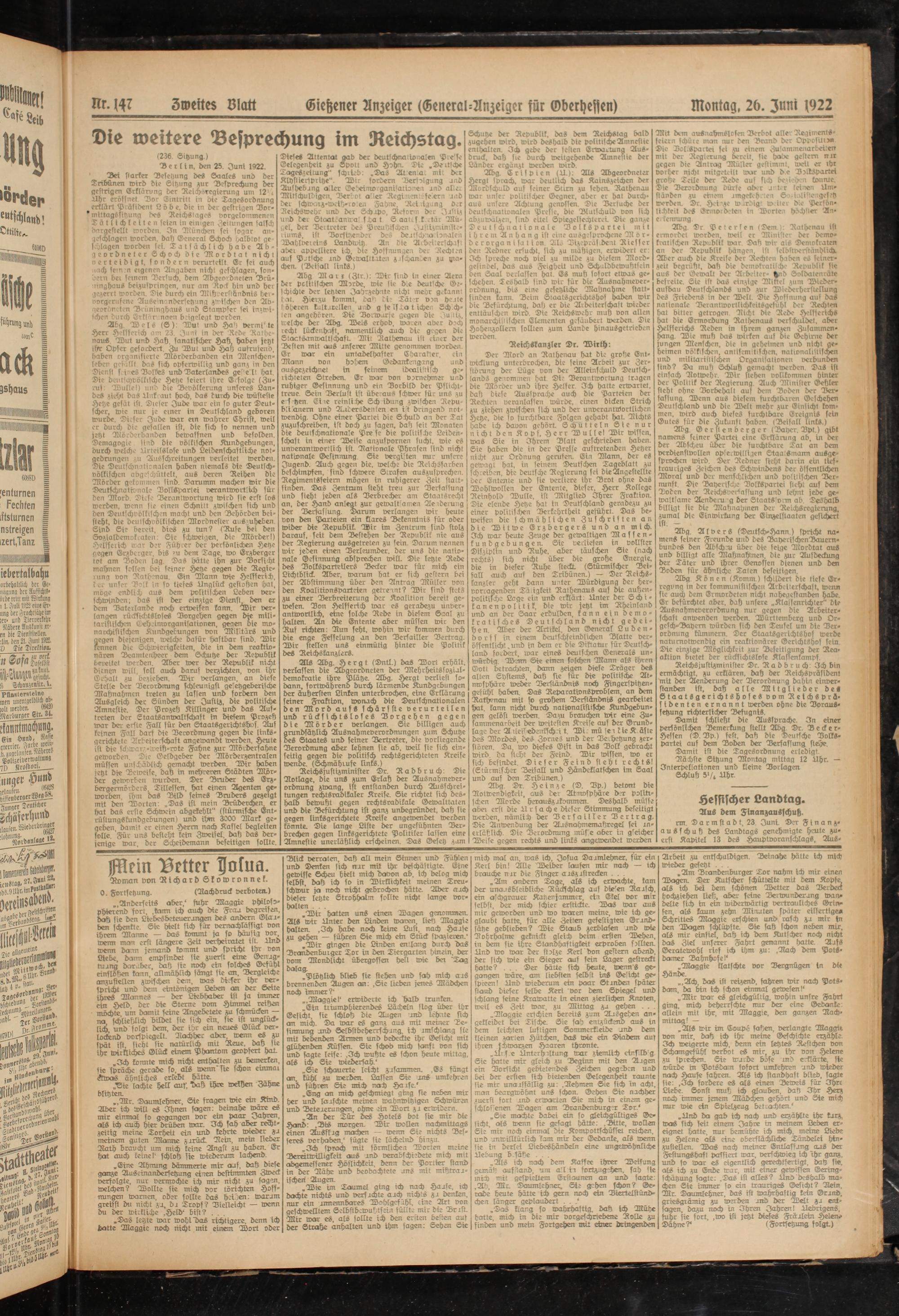 Rr. HZ Zweites Blatt Giehener Anzeiger (General-Anzeiger für Vberhessen)Montag, 2b. Juni 1922
