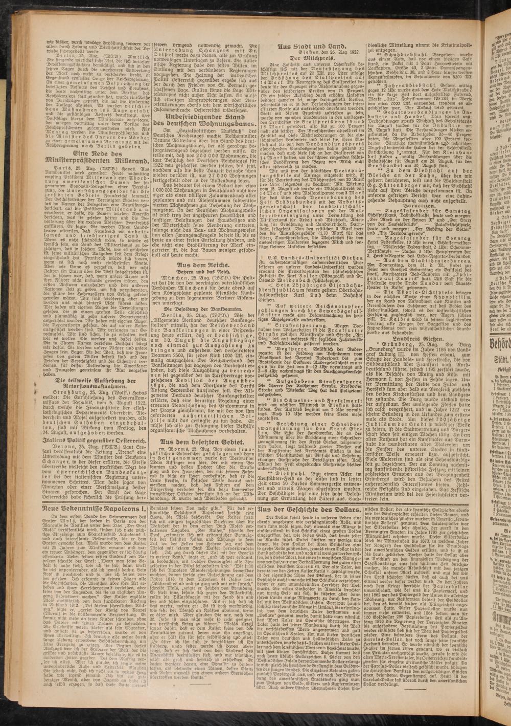 rm. Worms, 25. Aug. Don einem französischen Dolmetscher geschlagen und dann in Hast genommen wurde der Werkmeister Adam Kissinger von hier, der mit einem Bekannten und dessen Tochter über die Straße ging und den Franzosen, der mit seinem Fahrrad so dicht an ihnen vorbeifuhr, daß er die Leute streifte, in höflicher Weise darauf aufmerksam machte, daß das Fahren auf dem Bürgersteig verboten sei. Ein dazu kommender französischer Offizier beteiligte sich an der Mißhandlung. K. wurde nach Wiesbaden gebracht.