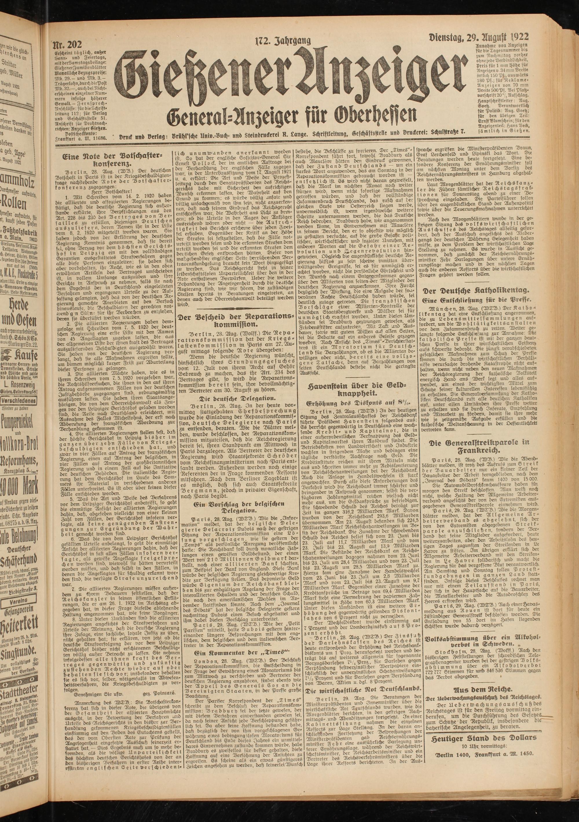 Dienstag, 29. August 1922
