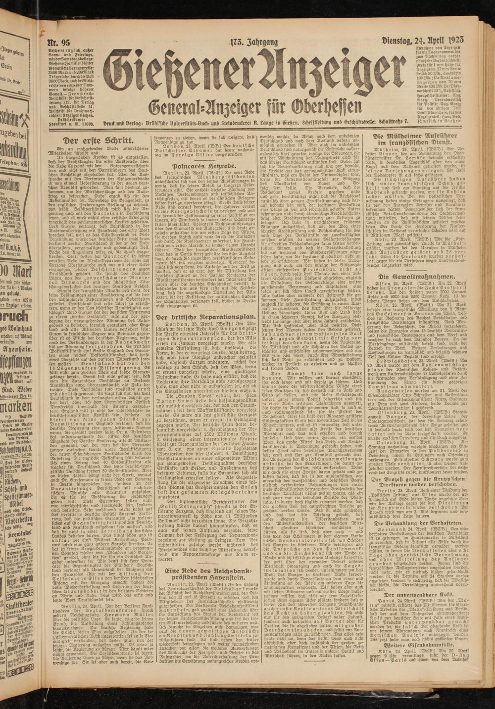 Annahme von Anzeigen für die Tagesnummer bis zum Nachmittag vorher ahnejede Verbindlichkeit. Preis für 1 mm höhe für Anzeigern,. 27 mm Breite örtlich 80 Mk., auswärts 100 Mk.; für Reklame« Anzeigen von 70 mm Breite 400 MK.Bei Platz. Vorschrift 20°/, Aufschlag. Hauptschriftleiter: Aug. Goetz. Verantwortlich für Politik: Aug. Goetz; für den übrigen Teil: Ernst Blumschein;fürben Anzeigenteil: Hans Beck, sämtlich in (Biegen.