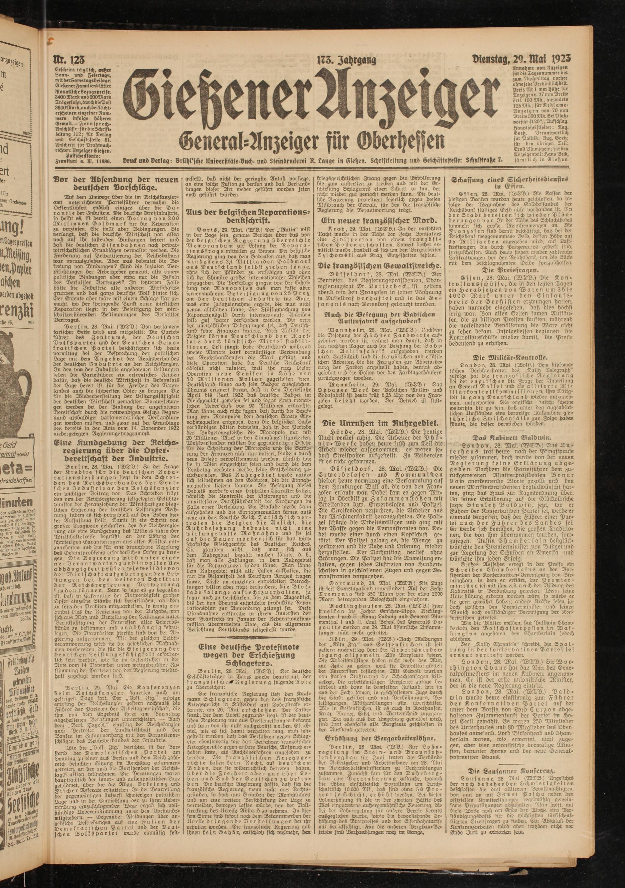 Annahme von Anzeige« für die Tagesnummer bis zum Nachmittag vorher ohnejede Verbindlichkeit. Preis für 1 mm höhe für Anzeigeno. 27 mm Breite örtl. 100 Mk., auswärts 125MK.; für Reklame« Anzeigen von 70 mm Breite 500 MK.Bei Platz« Vorschrift 20 °/? Aufschlag. Hauptschriftleiter: Aug. Goetz. Verantwortlich für Politik: Aug. Goetz; für den übrigen Teil: Ernst Blumschein; für den Anzeigenteil: Hans Beck, sämtlich in Gießen