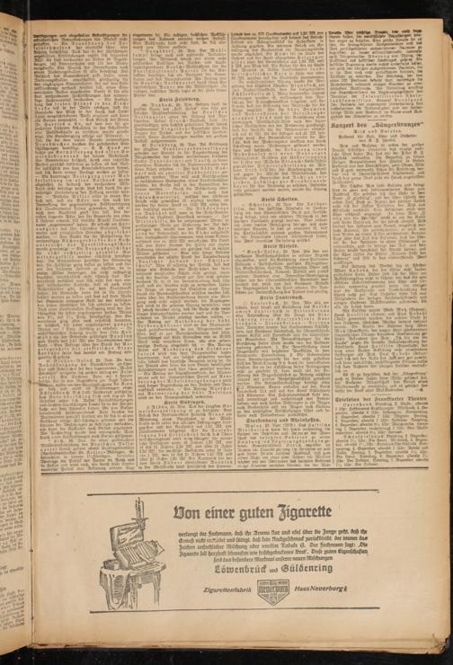Die Leitung des Werkes lag in Händen Albert Kastens, ber be Chöre recht sauber einstudiert batte. Leider lieh sich der Chor am Ausführungstag nicht so führen, wie da» für eure absolute Lieberrinstinnnung von Chor tmb Orchester notwendig gewesen wäre. 3m übrigen toar die Aussprache unb Tonbehandlung bes Chors recht gut. Das Orchester setzte sich aus Mitgliedern ber hiesigen Reichswehrkapelle und einigen (Siebener Musikfreunden zusammen, die alle ihr bestes boten.