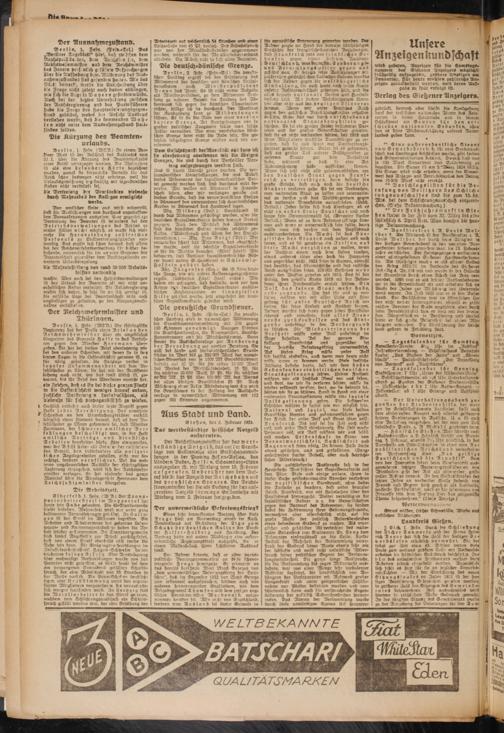 — Hänischin Gießen. Man schreibt UN-: .Kultusminister a D Hänilch spricht am Dienstag, 5. Februar, abends 71/, Ubr p'inlllich, In der Turnhalle am OSW-ll>sqar « in einer vom Republikanischen Reichsbund twranflal:«- t« Versammlung über: .Das geistige Deutschland unb die Republik^. Dem von d« Franzosen sofort beim Di nf'antritt aus- getr*f«en jetzigen Regieini"gzPräsiden« t*nn Wiesbadm g ht der Rus als qlln enbtr. geistvoller R b «r voraus In ben Geistes'ämpf« Der letzt« Jahre an vorderster Stelle st«h«d. von Freund und Gegner hoch geach et als kraftvolle, packende Pe-sönltchkei . wird et für jedermann von Interesse fein dem Vor'rnq über drs zeitgemäß» Thema bcizuwohn«.- (ekle Anzeige.)