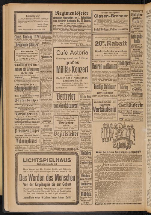 mit allerbester Garderobe für vornehme Reisetätigheit zum Besuch der Privathundschaft in Gießen und Umgebung sowie für besetztes Gebiet gesucht. Sehr hohes Einkommen nachweisbar, doch wollen sich nur energische und fleihige Vertreter melden. Meldung erbeten Dienstag vormittag von 10-12 Uhr im Hotel schütz