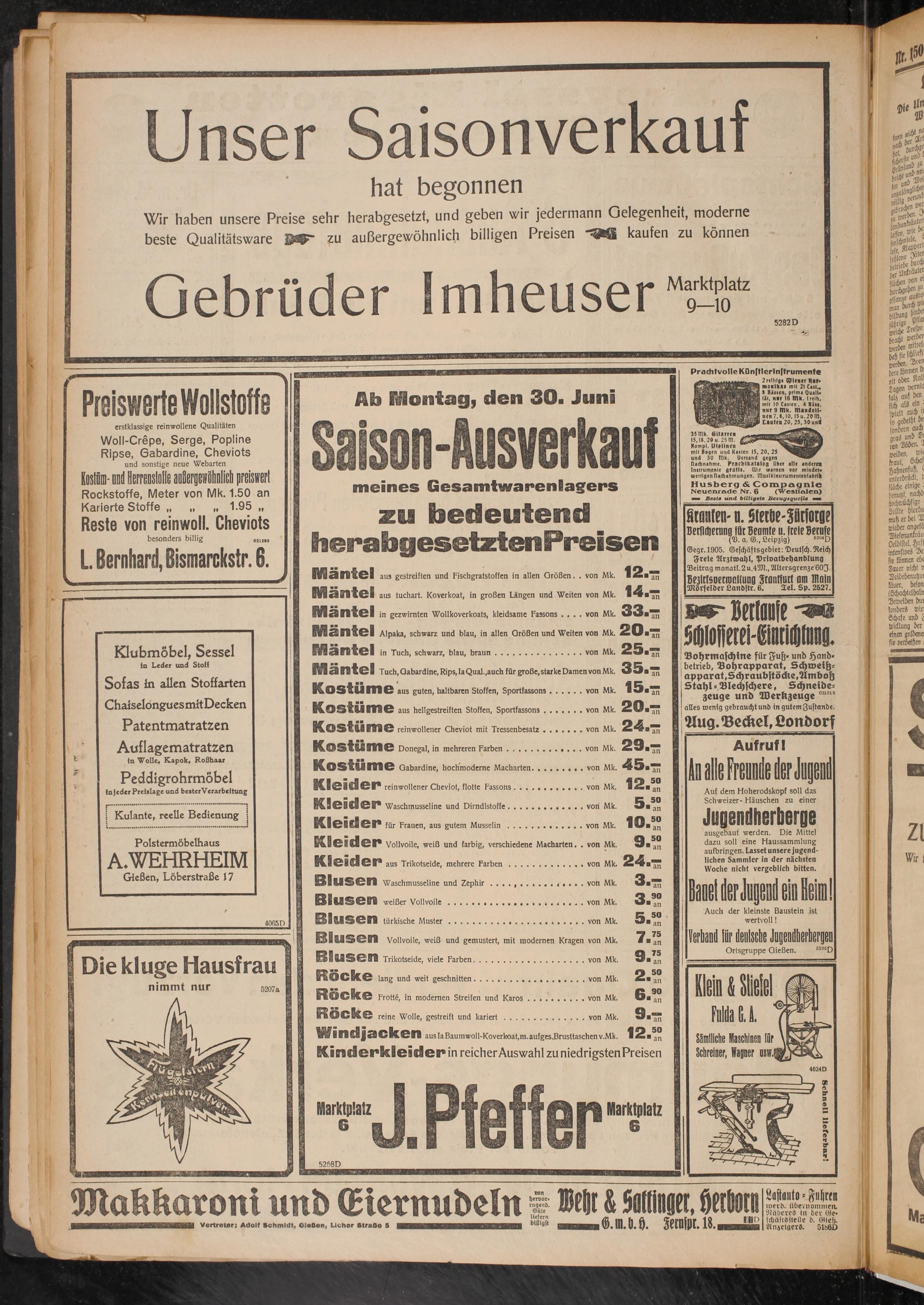 Unser Saisonverkauf hat begonnen Wir haben unsere Preise sehr herabgesetzt, und geben wir jedermann Gelegenheit, moderne beste Qualitätsware AM" zu außergewöhnlich billigen Preisen *98 kaufen zu können