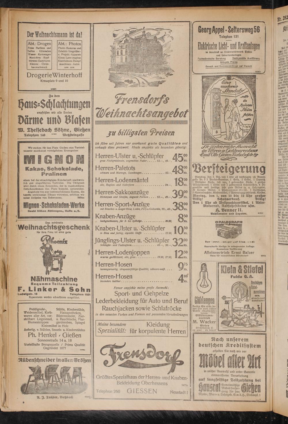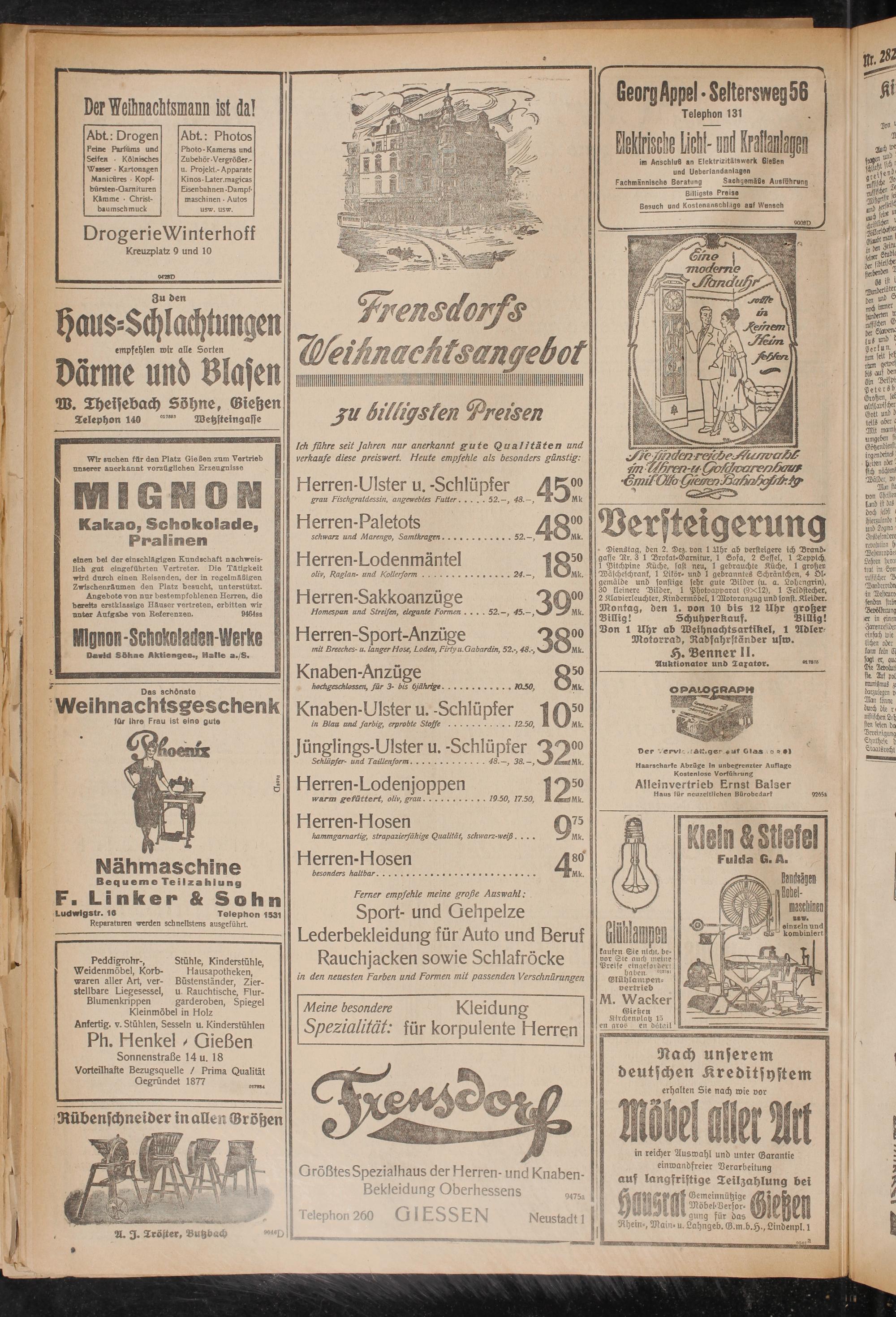 Dienstag, den 2. Dez. von 1 Uhr ab versteigere ich Brand- gaste Br. 3 1 Brokat-Garnitur, 1 Sofa, 2 Sessel, 1 Teppich 1 Pitchpine Küche, fast neu, 1 gebrauchte Küche, 1 großen Wäscheschrank, 1 Likör- und 1 gebranntes Schränkchen, 4 Ölgemälde und sonstige sehr gute Bilder (u. a. Lohengrin), 30 kleinere Bilder, 1 Photoapparat (9x12), 1 Feldstecher, 2 Klavierleuchter, Kindermöbel, 1 Motoranzug und sonst. Kleider. Montag, drn 1. von 10 bis 12 Uhr großer Billig! Schuhverkauf. Billig! Don 1 Uhr ab Weihnachtsartikel, 1 Adler